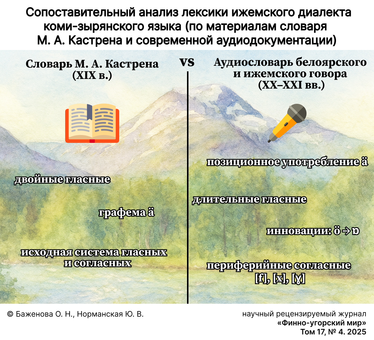 Целью исследования является выявление и описание фонетических соответствий в ижемском диалекте коми-зырянского языка на материале двух корпусов, разделенных значительным временным интервалом: словаря М. А. Кастрена (1844 г.; критическое издание 2022 г.) и аудиословаря говора с. Белоярск Приуральского района Ямало-Ненецкого автономного округа (2012 г.). Сопоставление позволяет проследить динамику вокализма и консонантизма, уточнить характер количественных и качественных изменений в системе гласных и согласных, а также определить степень сохранности архаических черт и проявления инновационных процессов.