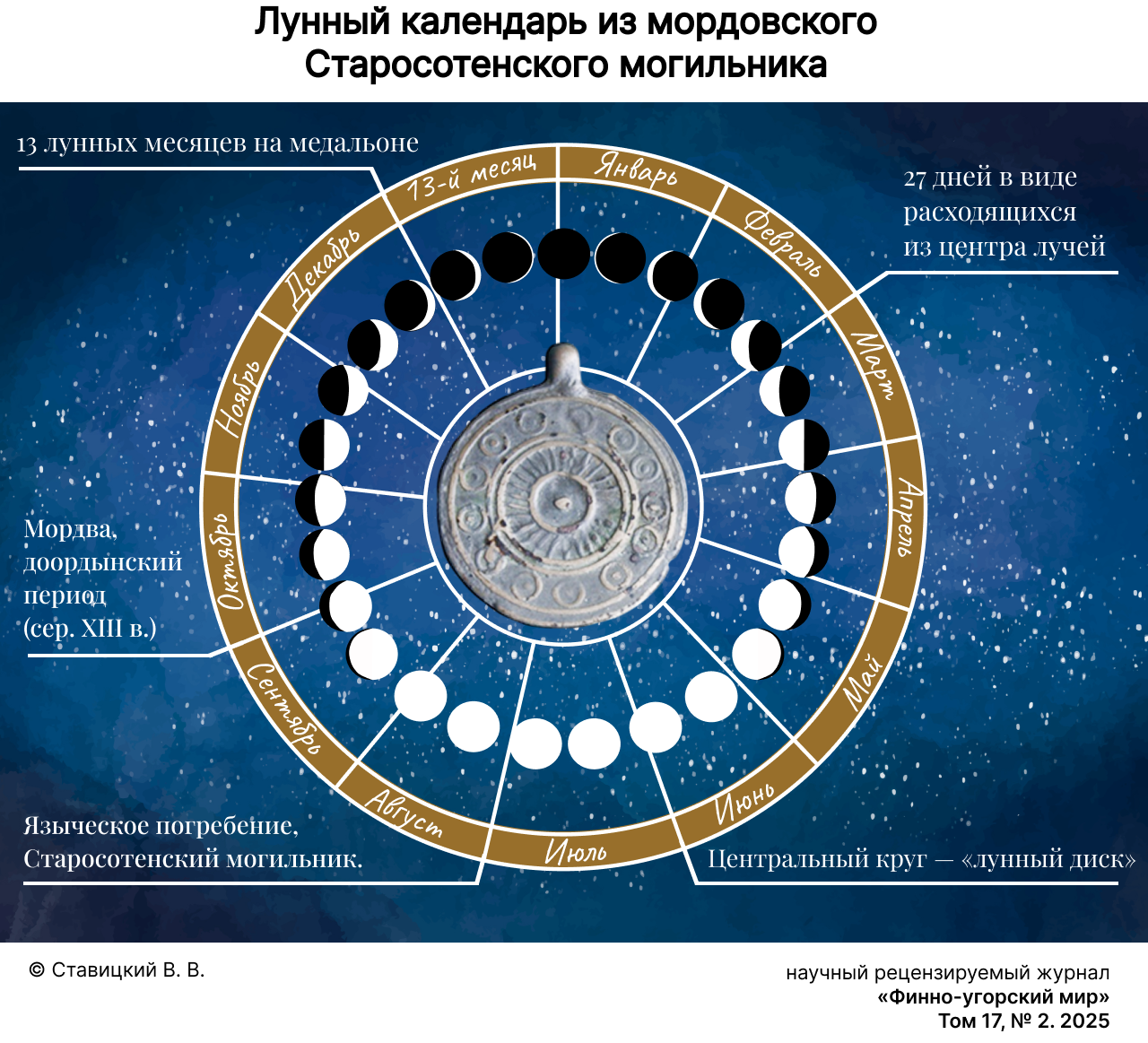 Заключение. Находка изображения лунного календаря в мордовском языческом погребении XIII в. свидетельствует о том, что у мордвы лунное исчисление времени бытовало вплоть до эпохи позднего средневековья. Вероятно, календарь был изготовлен местными мастерами по образцам вятических монетовидных подвесок. Уточнение этнокультурной и конфессиональной принадлежности захоронения с календарем позволило расширить число вещественных свидетельств распространения лунных календарей в языческих средневековых культурах финно-угорских народов.