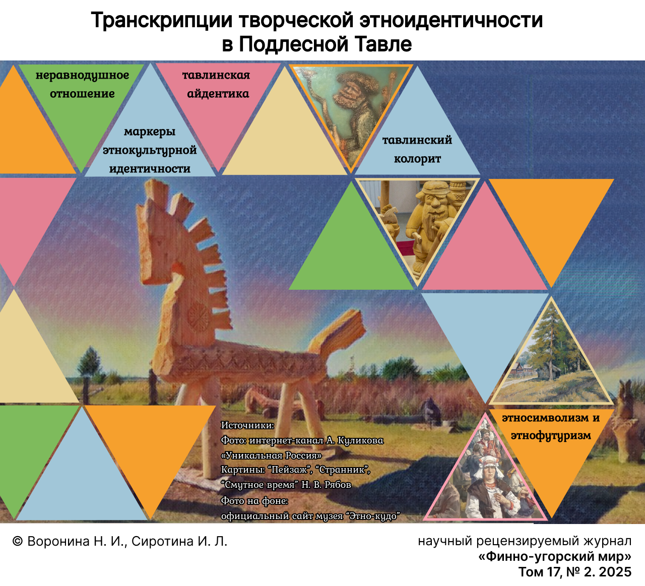 Введение. В статье обосновывается феномен пространства этноидентичности эрзянского села Подлесная Тавла в Кочкуровском районе Республики Мордовия, уроженцы которого воплотили свою «тавлинскую идентичность» в различных формах и видах художественных практик. Творчество отдельных тавлинцев находит отражение в репортажах с выставок и редких публикациях, однако до настоящего времени не создано целостного труда, который представил бы комплексно культурный пласт творческих поисков тавлинских художников, музыкантов, резчиков.