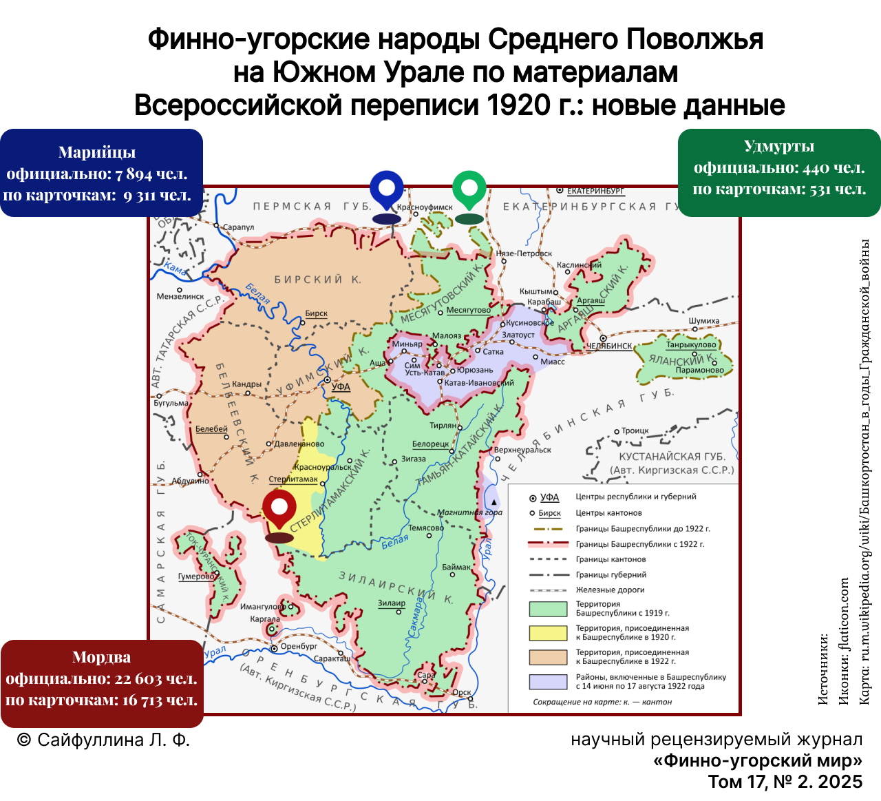 Результаты исследования и их обсуждение. Выявлены существенные расхождения между данными подворных карточек и официальными итогами переписи 1920 г. Установлено, что численность мордвы (16 713 чел.) была занижена официальной статистикой на 26 % (22 603 чел.), в то время как численность марийцев (9 311 чел.) и удмуртов (531 чел.) оказалась выше официальных данных (7 894 чел. и 440 чел. соответственно). Несоответствия между первичными данными и опубликованными итогами объясняются возможной утратой части карточек и/или ошибками при их сводке. Определены географические ареалы расселения: мордва компактно проживала в центральных и южных районах Малой Башкирии, с максимальной концентрацией в Стерлитамакском кантоне (9 069 чел.). Основная часть марийцев и удмуртов расселялась на северо-востоке региона, преимущественно на территории бывшего Красноуфимского уезда Пермской губернии.