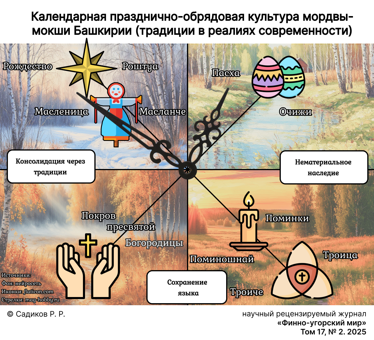 Введение. Календарная обрядность выступает ключевым элементом этнических традиций любого народа. Несмотря на детальную изученность мордовской традиционной обрядности, остаются недостаточно исследованными ее проявления в диаспорных группах, в частности у мокши, проживающей на территории Башкирии. При длительном взаимодействии с тюркскими народами мокша сохранила многие этнодифференцирующие черты своей культуры. Цель исследования – анализ современного состояния календарной празднично-обрядовой культуры мордвы-мокши в Башкирии.