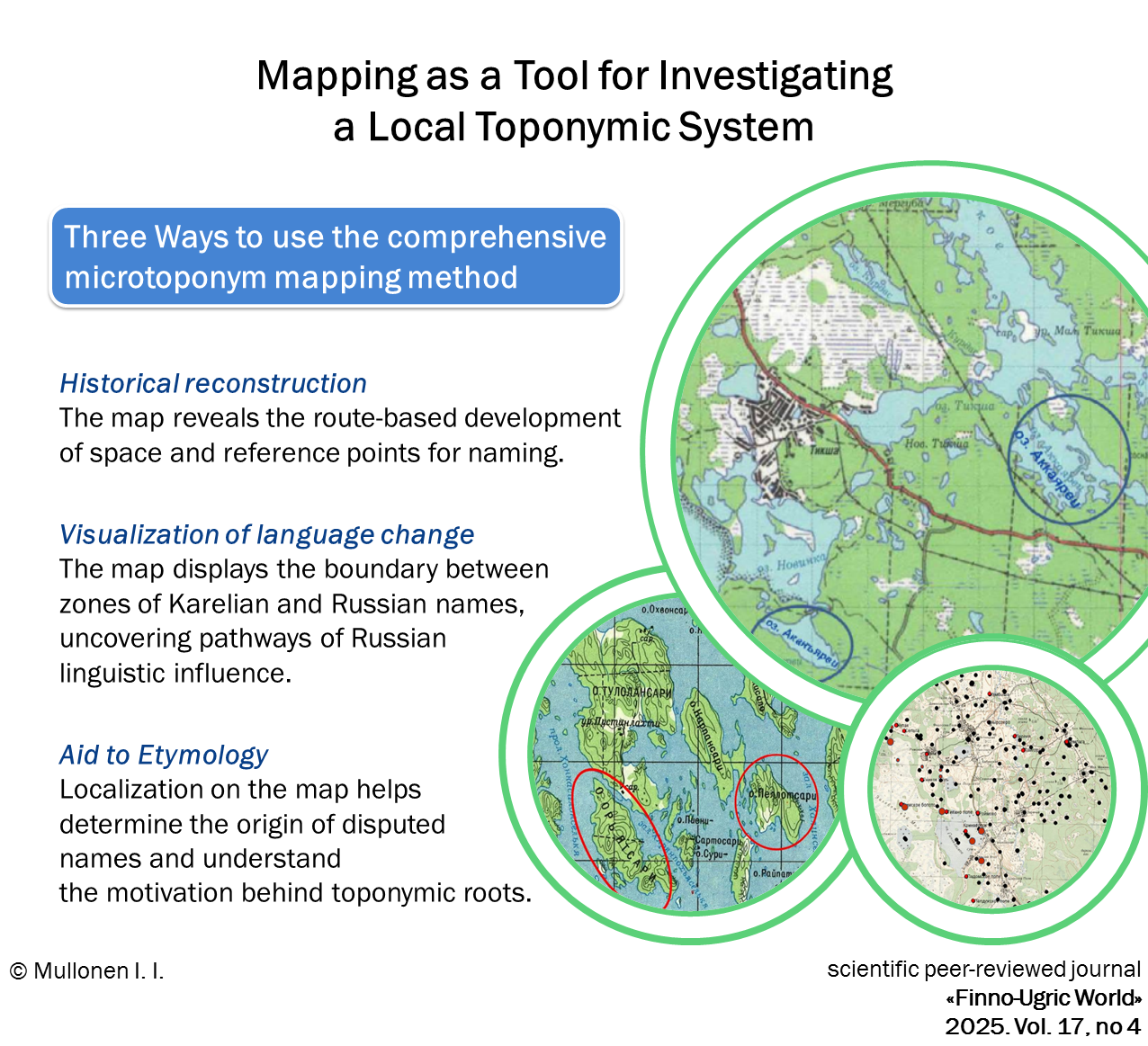 Materials and Methods. The research material was the Card Index of Karelia Toponyms, in which a significant portion of the microtoponyms are linked to topographic maps. Based on the card index data, an electronic resource – the “Toponymy of Karelia” geographic information system (GIS) – was created, which enables the mapping of toponymy within local topo-systems. The study employs maps of various formats as illustrations, ranging from standard maps of the “Atlas of Karelia” (scale 1 cm = 1 km) to field sketches and electronic maps in the OpenStreetMap format. In addition to the cartographic method itself, the methodology of etymological reconstruction and semantic analysis was employed.
