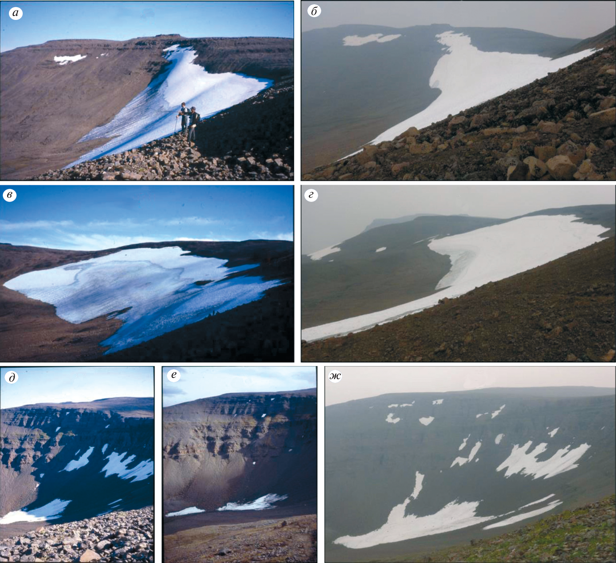The characteristic feature of the Putorana Plateau is that the glaciological objects here are mostly represented by small glaciers and perennial snow patches. Their regime and morphology have so much common features that separation of these two categories of nival glacial formations from one another is extremely difficult problem. The distinctions between results of earlier studies carried out in the 1970s (the USSR Glacier Inventory estimated local resources at 22 glaciers with a total area of 2.5 km2) and at the beginning of the current century (in 2005, V.A. Sarana identified 61 glaciers with a total area of 7 km2) are too large to make any reliable conclusions about the current trends of the Putoran glaciation. In such conditions, the materials of rare field monitoring work performed on individual nival-glacial bodies become very valuable. Three expedition seasons of 2002–2004 included thorough geodetic and mass-balance measurements on 3 reference objects on the northern ledge of Lama Mts. – Prives (No. 30) Glacier, Marlborough (No. 31) Glacier and Strudoms snow patch. Similar field monitoring was repeated in summer’2019. The change in their configuration according to digital photography data, including the results of the analysis of satellite images, make possible to reveal that interannual fluctuations in the area of each glacier occur due to different vector displacements of its different sections along their entire perimeters. In 2019, the somewhat unexpected good budget state of all 3 monitored objects was detected. It manifested itself in growth of their areas and increased fraction of firn basin as well as in larger water equivalent of the firn residue as this followed from results of snow surveys. This fact contradicts the previous conclusion about the steady trend of deglaciation on the Putorana Plateau. The favourable condition for small glaciers occurred here in 2019 was mainly caused by reduced ablation owing to the weakened insolation that resulted from tremendous forest fires in Siberia, remarkable by their abnormal intensity in this year.