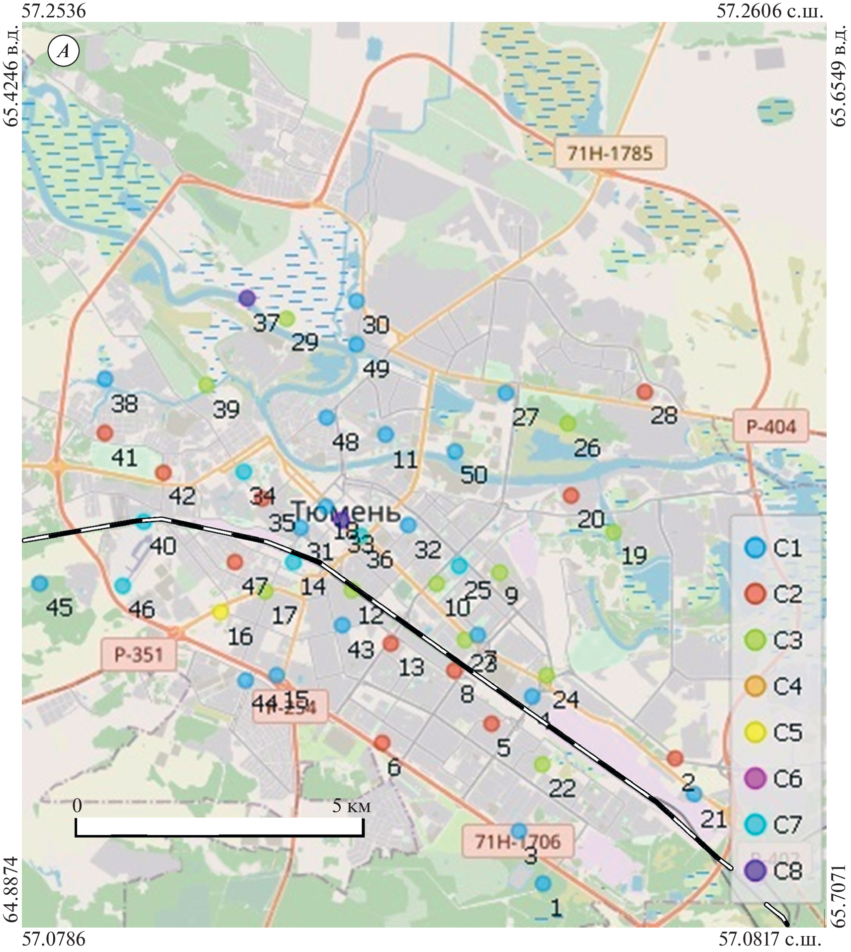 Inhomogeneities of trace elements content in dust of snow cover were studied in two industrial Siberian cities Tobolsk and Tyumen. The clustering method was used, for which standardized values of the content of trace elements in the snow dust of both cities were used. Eight clusters have been identified, which were divided into two classes by location: Tyumen and Tobolsk. The classes were divided into groups: non-specific and specific ones, of which the two subgroups were distinguished: technogenic and natural. The average values of trace elements in nominal terms were calculated for each cluster. Clusters C1, C2, C4, C7, C8 are characterized by a high content of heavy metals V, Cr, Ni, Cu, Co, Zn, Cd, W, Pb. Background clusters C5 and C6 have a low content of trace elements. Specific technogenic C4 contains more copper than other clusters, and C2 contains more lead. Sources of the formation of technogenic clusters are emissions into the atmosphere of enterprises of the fuel and energy complex, foundry and machine-building industries, and transport. The heterogeneity of the content of microelements in the snow dust under background conditions is demonstrated. The microelements are divided into natural background (cluster C5) and the background with anthropogenic pollution with higher content of Ag and Sn (cluster C6). In urban conditions, a solid phase of snow with a low and minimal content of trace elements in dust (cluster C3) is formed. Increased content of Ni and a reduced content of Pb and Sc is noted in the C3 cluster relative to C5 щту. Using the Mann-Whitne test, it was revealed that the content of trace elements in snow dust within the cities Tyumen and Tobolsk are different for the following elements: Li, V, Cr, Cu, Zn, Ga, As, Rb, Sr, Y, Zr, Nb, Mo, Ag, Cd, Sb, Cs, Ba, Pb. Mean values in are higher than similar ones in Tyumen. The content of Zn, As, Rb, Sc elements in urban clusters differs by more than two times relative to the background ones. In the case of elements Sn, Cs, W, the content of them in the snow dust of Tyumen is higher than that of Tobolsk. The method of clustering makes possible to identify natural background values (C5) and to calculate more precise values of the coefficient Kc as well as to determine the index of the integral pollution. In Tobolsk, the index is indicative of high and dangerous level of pollution, especially in the zone of technogenic impact. The average level is typical for the city of Tyumen.