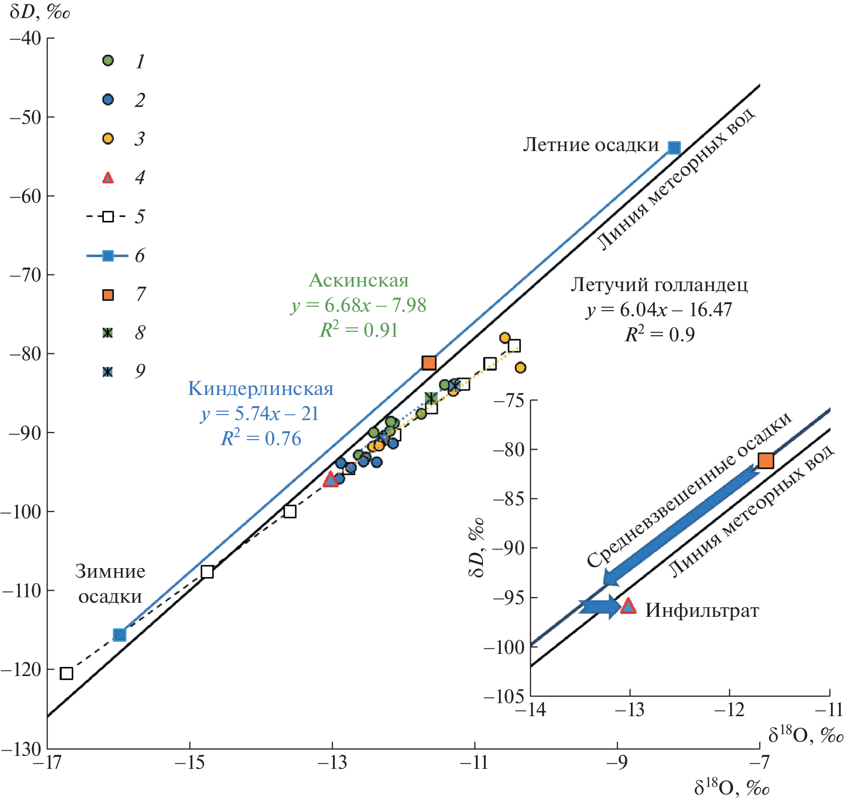 The aim of this work was to determine mechanisms of formation of perennial ice in caves of the Southern Urals, as well as to find sources of water and processes responsible for the formation of isotopic parameters of the cave ice. Isotopes δ18О and δD were investigated. The caves Askinskaya and Kinderlinskaya are the most famous ones in the Southern Urals located at the lowest levels a.s.l. (260 and 208 m, respectively). In the summer of 2019, samples of perennial ice and infiltration water were taken in both caves. Ices of the Askinskaya and Kinderlinskaya caves are characterized by a narrow range of δ18О and δD values with very slight variations in depth: −11.42…−12.89‰ and −83.8…−95.7‰, respectively. Values the isotopes in the infiltration water sampled in the Kinderlinskaya cave are: δ18О = −13 and δD = −76‰. For both Askinskaya and Kinderlinskaya caves, the isotopic parameters of ice correspond to the calculated line of Rayleigh crystallization in a closed system when water with the isotopes freezes. The narrow range of values δ18О and δD suggests that aufeises (naleds) existing in caves for many years are the congelation (hydrogenic) ice formed by the growth of thin water layers freezing through at a high rates. Infiltration waters are formed mainly due to the precipitation of the winter seasons. The ratio between winter and summer precipitation is about 2:1. The infiltration type of the cave ice alimentation as well as evidence of long time of averaging of the isotopic signal in the atmospheric precipitation do not allow to use the cave ices as a climatic (paleo)archive.