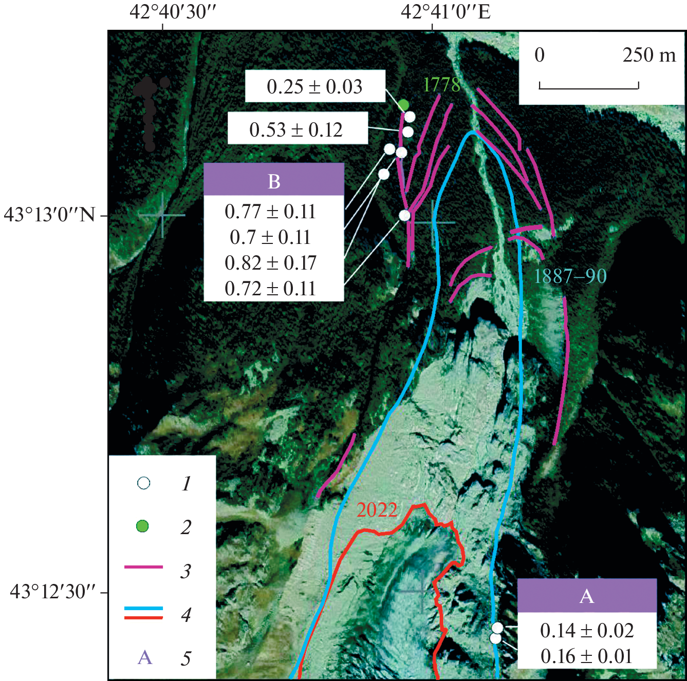 - Solomina O.N., Bushueva I.S., Volodicheva N.A., Dolgova E.A. Age of moraines of the Bolshoy Azau Glacier in the upper course of the Baksan River valley according to dendrochronological data. Led i Sneg. Ice and Snow. 2021, 61 (2): 271–290 [In Russian].https://doi.org/10.31857/S2076673421020088
