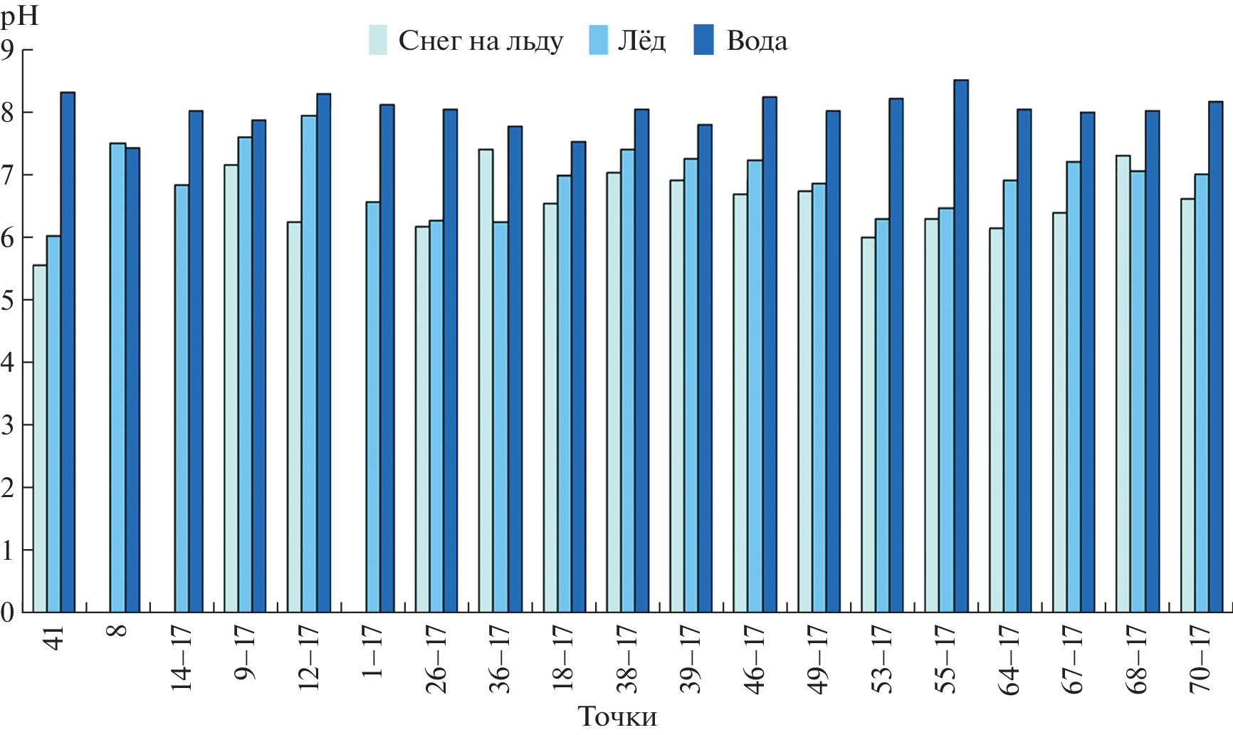 The results of studies of the chemical composition and the basic regularities of migration of macro- and microelements within the hydro-cryogenic system “snow on ice–ice–water under ice” obtained in the winter of 2016/17 in the waters of Lake Baikal are presented. Such investigation over the Lake area was carried out for the first time. It has been found that due to climatic conditions, dates of freeze-up (formation of the ice on the Lake) differ by 7–10 days from North to South, and the depth of snow on ice and its density change over the Lake area by 2 times, however there are some parts without snow. It was found that the changes in the pH indexes were identical across the whole Lake area – minimum pH values are present in the snow (from 5.59 to 7.39), average values – in the ice (6.01–7.50), and maximum values are noted in the water under ice (7.42–8.50). For the most part, increased quantities of suspended matter and an increase in the pH of snow were recorded near settlements, which is obviously a result of the anthropogenic influence. It was determined that the concentration of ions in the ice in relation to their content in the initial solutions decreases within the series: \({\text{NO}}_{2}^{ - }\) > Cl– > \({\text{SO}}_{4}^{{2 - }}\) > \({\text{HCO}}_{3}^{ - }\). Among the cations, K+, Na+ ions are involved into the ice intensively, while the Ca2+ and Mg2+ – weakly. The ice phase is enriched with ammonium ions outside the settlements. Near settlements and in shallow water, quantity of salts in the ice may be close to or equal to their concentration in the water under ice. The coefficient of migration in the water (Kx) divide the chemical elements into two groups – the mobile ones and slow-moving elements. The first group includes Ca, Cu, Sr, Mg, Co, Zn, and Cd (Kx >1), the second one contains Ba, Mn, Si, Fe, Al, Ti, Ni, Cr, P, and K.