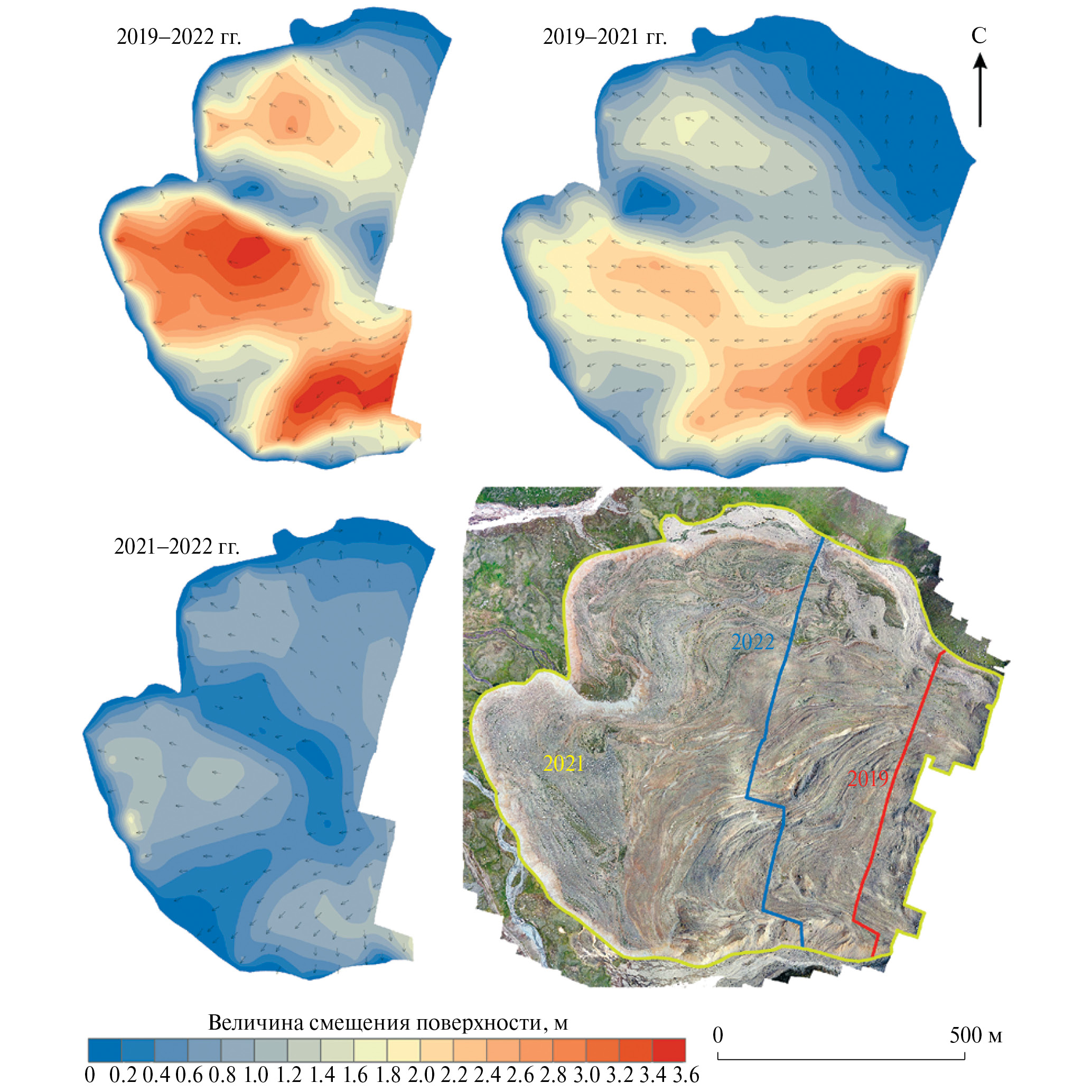 Так как в 2020 г. измерения не проводились, годовая оценка скорости смещения поверхности каменного глетчера между 2019 и 2021 г. усреднена за два года. Она составляет от 0.1 м/год на севере и северо-востоке до 1.2 м/год в западной и до 1.8 м/год в южной части. Между 2021 и 2022 г. пространственные закономерности скорости смещения поверхности сохраняются, а абсолютные значения претерпевают разнонаправленные изменения. Они составляют до 0.9 м/год в северо-западной части, 1.8 м/год в западной и 1.5 м/год в южной.