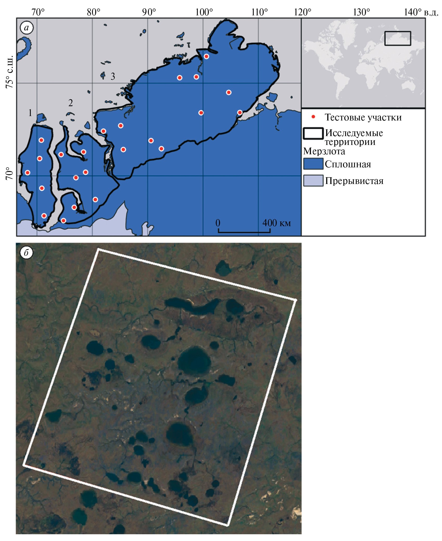 Рис. 1. Расположение тестовых участков и границ исследованных территорий Ямала (1), Гыдана (2) и Таймыра (3) на карте-схеме геокриологического зонирования (а) и фрагмент космического снимка территории Таймыра с обозначенной границей тестового участка (б).