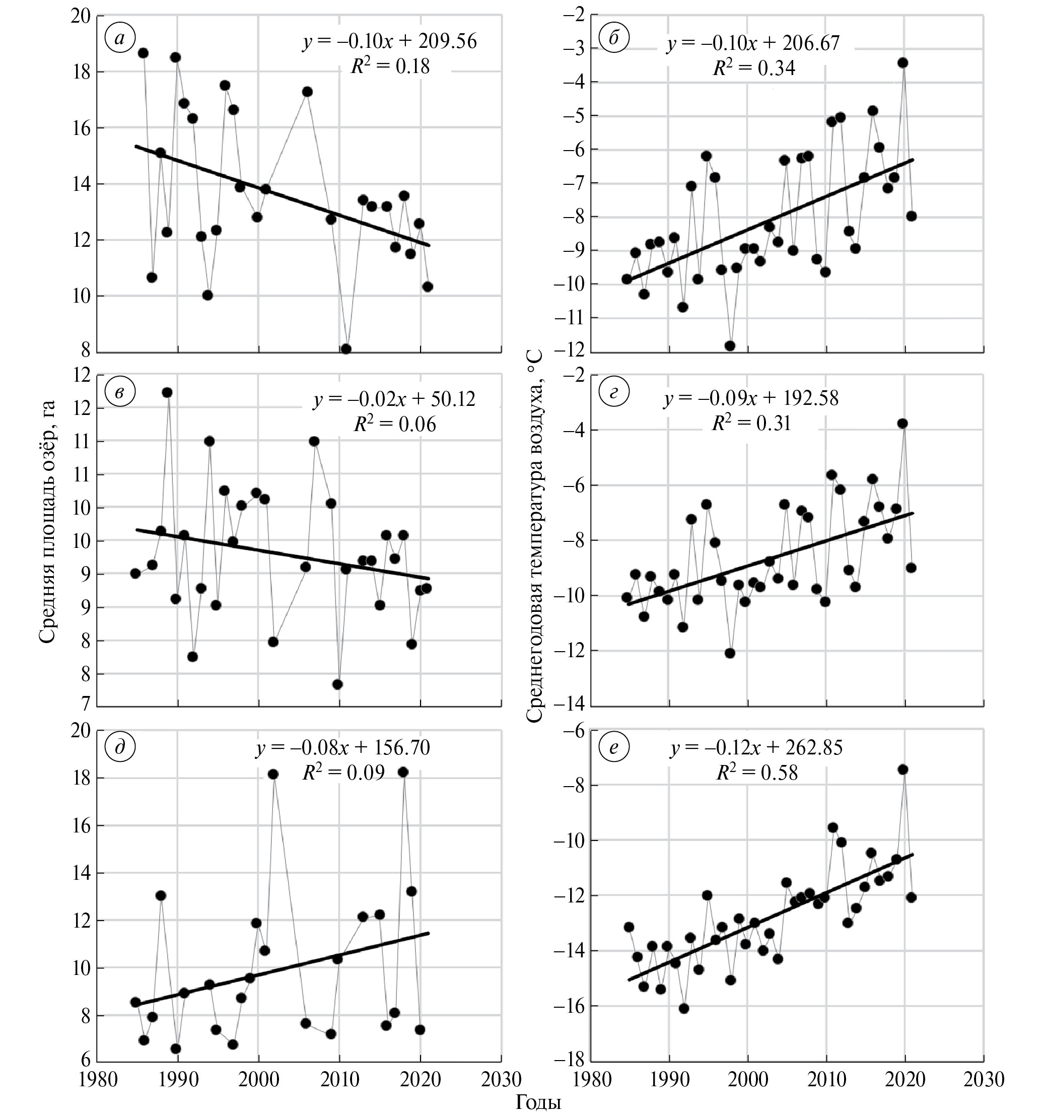 На рис. 2 представлены графики временных рядов значений средних площадей озёр и среднегодовой температуры воздуха на разных территориях исследований. Для изучения особенностей динамики площадей озёр в условиях воздействия изменений температуры на разных территориях исследования временные ряды (см. рис. 2) аппроксимировались линейным уравнением