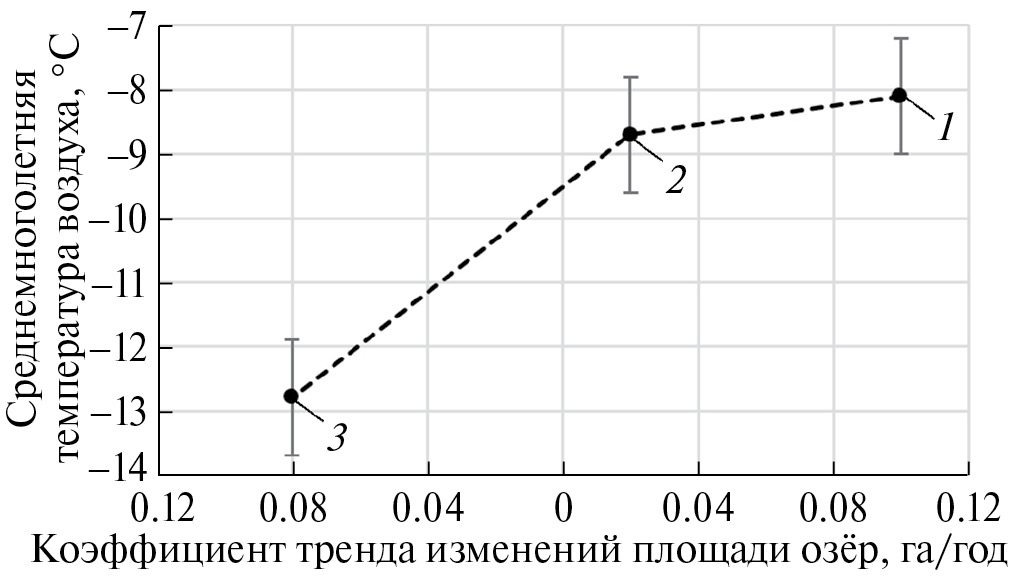 Рис. 3. Сопоставление величин коэффициентов линейного тренда изменений площади озёр и средней (за период 1985–2021 гг.) температуры воздуха на территориях Ямала (1), Гыдана (2) и Таймыра (3).