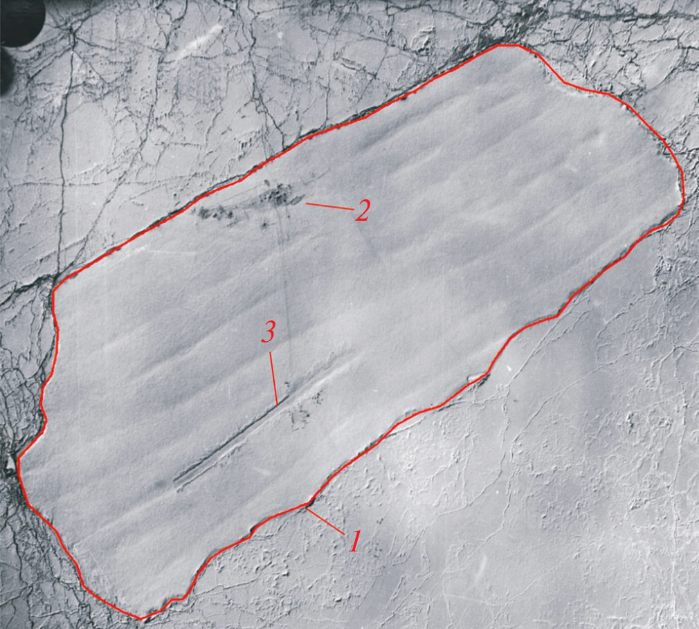Fig. 1. Aerial photo of the ice island of NP-22. Photo from the AARI archive: 1 — boundaries of the ice island of NP-22; 2 — ice camp of the NP-22; 3 — runway.