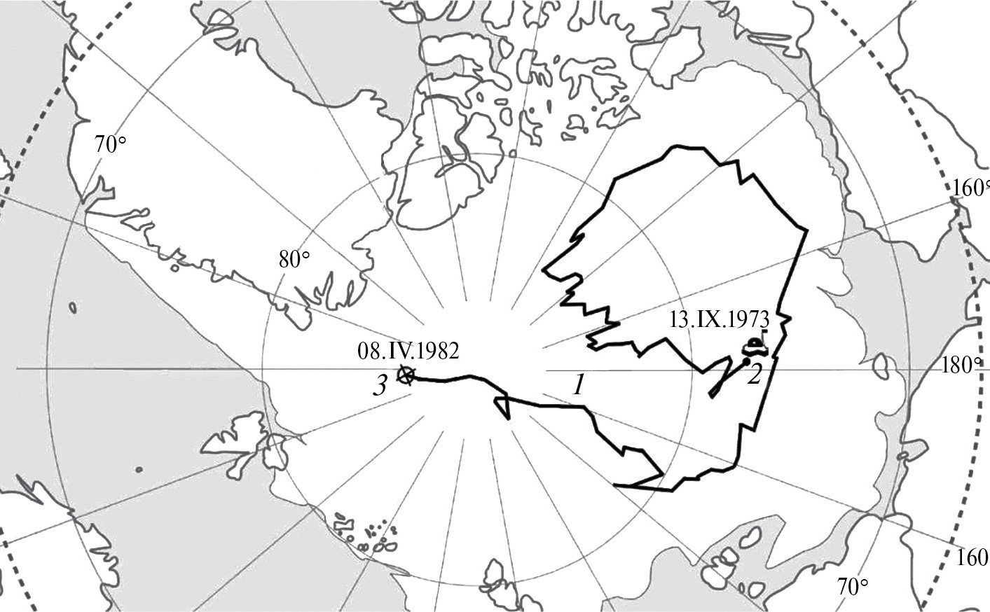 Рис. 2. Схема дрейфа станции СП-22 в 1973–1982 гг.: 1 — траектория дрейфа; 2 — точка и дата открытия станции; 3 — точка и дата завершения дрейфа.