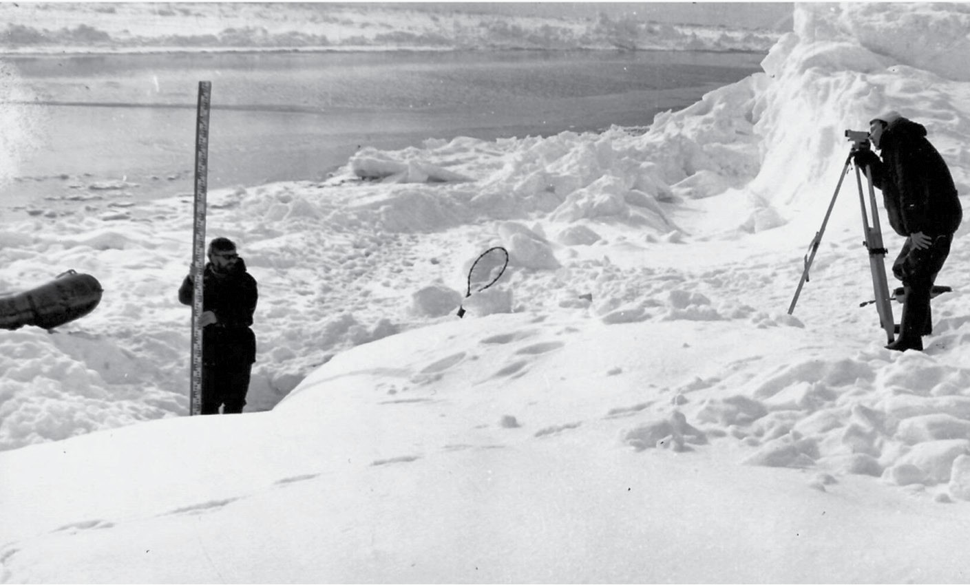 Fig. 3. Measurements of morphological parameters of sea ice freeboard in the area of NP-22. April of 1974. Photo by N. M. Shestakov.