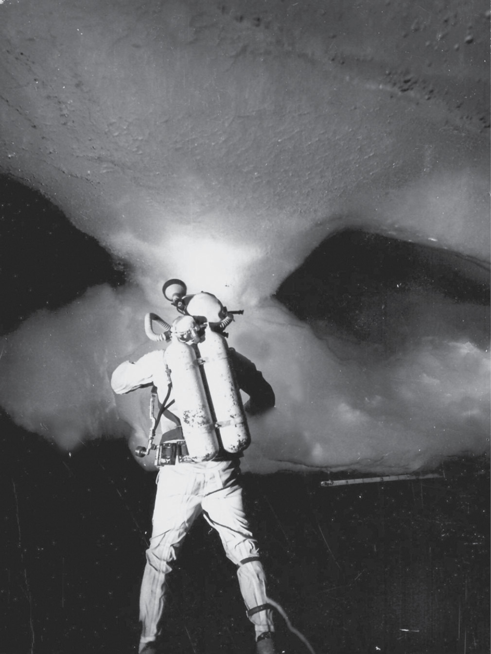 Рис. 4. Аквалангист-исследователь измеряет характеристики подводной части гряды торосов в районе СП-22. Апрель 1974 г. Фото Н. М. Шестакова.