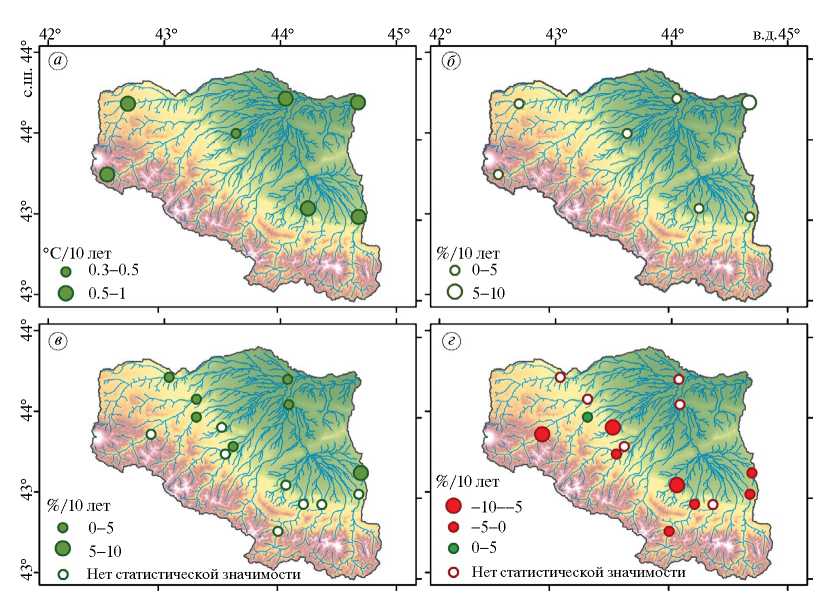 Для выявления современных временных трендов основных гидрологических и метеорологических характеристик использовались модифицированный параметрический критерий Стьюдента (Santer et al., 2000) и модифицированный непараметрический критерий Манна — Кендалла (Hamed, Rао, 1998). По результатам анализа фактических данных метеостанций в пределах высокогорной части бассейна р. Терек наблюдается повсеместное увеличение среднегодовой температуры воздуха со средней интенсивностью до 0.7 ⁰С/10 лет за период 1977—2014 гг. При этом температура увеличивается главным образом в летние месяцы с интенсивностью 0.3—0.7 °C/10 лет. Статистически значимых трендов изменения годовой суммы осадков по данным метеорологических станций не выявлено (рис. 2). По результатам оценки временных трендов среднегодовых и максимальных расходов воды по фактическим данным на 15 постах за период наблюдений с 1970 по 2018 г. среднегодовые расходы воды за 1970—2018 гг. увеличиваются с интенсивностью 2—7%/10 лет, что может быть связано с общим увеличением годовой суммы осадков, наиболее ярко выраженным в равнинной и предгорной областях Северного Кавказа (Rets, Kireeva, 2010).