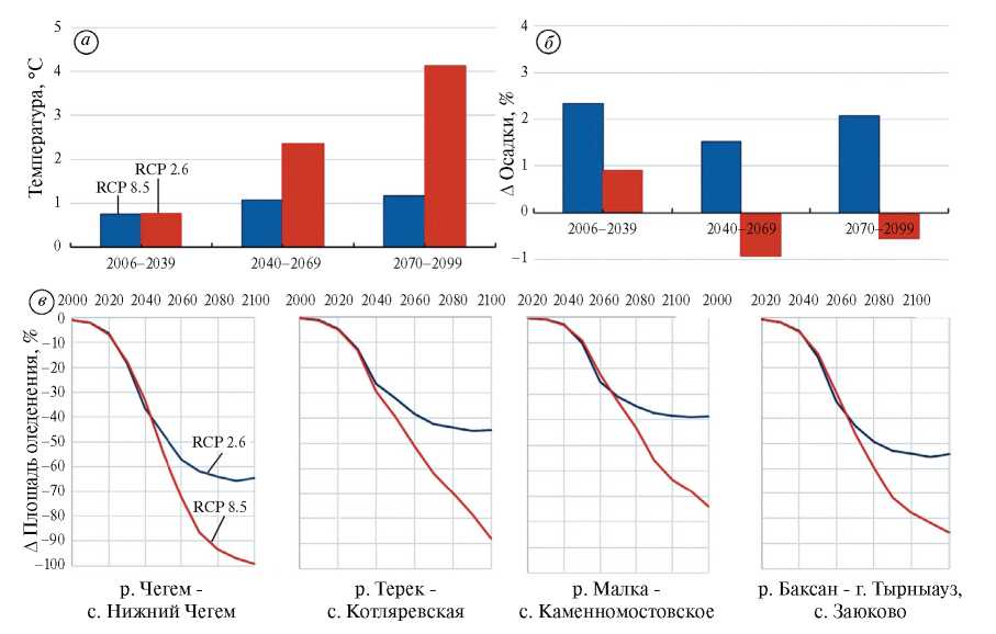 Рис. 4. Прогнозируемое изменение среднегодовой температуры воздуха (а), годовой суммы осадков (б) и площади оледенения (в) для бассейнов рек до различных замыкающих створов на территории бассейна р. Терек для двух сценариев (RCP2.6 и RCP8.5)