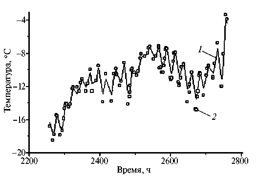 Температура снега: 1 – на уровне контакта снега с субстратом, 0 см; 2 – на высоте 5 см. Отсчёт времени от 01 января 1987 г.