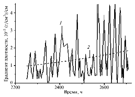 Рис. 2. Градиент плотности водяного пара: 1 – в приконтактном слое снега (0–5 см); 2 – тренд. Отсчёт времени от 1 января 1987 г.