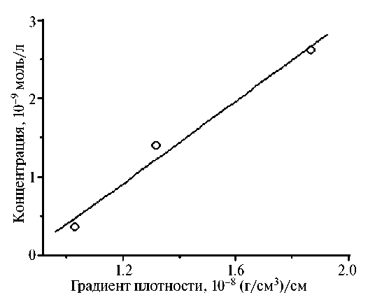 Из рис. 3–5 видно, что соответствие содержания ионов в приконтактном слое снежного покрова и градиента плотности пара описывается линейными зависимостями: для тиосульфатного комплекса золота: [Au(S2O3)23–] = 0.26·Δe — 2.23·10–9,, где Δe — градиент плотности пара (Павлов, 1979), с величиной достоверности аппроксимации 0.98; для ионов меди: [Cu2+] = 0.65·Δe + 2·10–9 с величиной достоверности аппроксимации 0.52; для ионов водорода: [H+] = 1.30·Δе + 1·10–7 с величиной достоверности аппроксимации 0.88; для ионов натрия: [Na+] = 114.4·Δе + 3·10–6 с величиной достоверности аппроксимации 0.69; для хлорид-анионов: [Cl–] = 998.6·Δе + 1·10–6 с величиной достоверности аппроксимации 0.89.