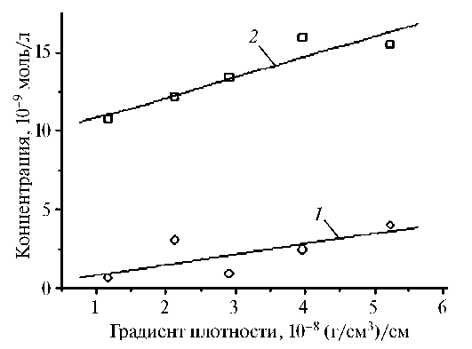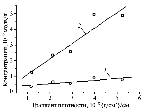 Рис. 4. Зависимость концентрации ионов меди Cu2+ (1) и водорода H+ (2) от градиента плотности водяного пара в слое снега 0–5 см на восходящей ветви «весеннего» максимума минерализации