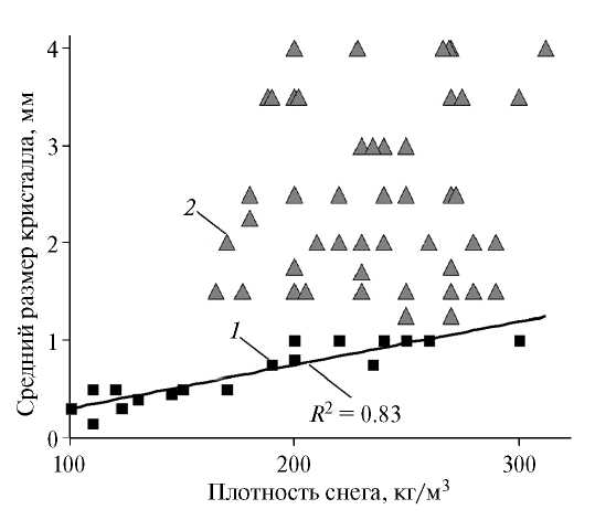 Fig. 2. The average size of crystals in snow layers depends on its density. 1 – deep hoar, 2 – granular snow