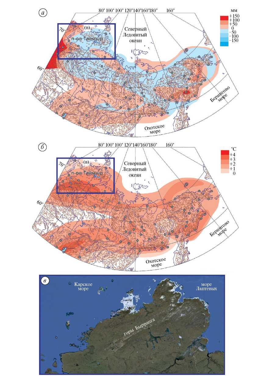 Максимум изменения Tsum приходится на область южнее п-ва Таймыр и в Корякском нагорье (см. рис. 1, а). Как было показано в работе (Титкова, Ананичева, 2023), наибольшие изменения Tyear (до 4–5 °C за период 1966–2021 гг.) характерны для самых северных (арктических) горных районов Таймыра и Чукотки, наименьшие значения – для гор Бырранга и юга Орулгана. Детальные карты трендов, построенные по данным реанализа ERA5-Land не противоречат общим тенденциям, отмеченным по данным наблюдений (Титкова, Ананичева, 2023). Годовые изменения Tyear максимальны в горах Бырранга – до 4–5 °C по данным реанализа. Летние тренды температуры здесь ниже на 1–2 °C. Летние температуры не демонстрируют столь высокой скорости потепления по сравнению со среднегодовой температурой, основное потепление происходит в холодный период. Для осадков холодного периода (см. рис. 1, б) и среднегодовых (Титкова, Ананичева, 2023) характерны отрицательные тренды для прибрежной полосы арктической зоны.