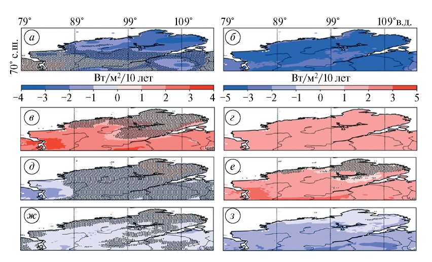 Рис. 2. Коэффициенты тренда (Вт/м2/10 лет) летних (июнь–август) суммарных значений приходящей коротковолновой радиации (а); отражённой коротковолновой радиации (б); коротковолнового радиационного баланса (в); приходящей длинноволновой радиации (г); длинноволнового радиационного баланса (д); суммарного радиационного баланса (е); явного потока тепла (ж); скрытого потока тепла за период 1966–2021 гг. Чёрной штриховкой показаны области, где тренд статистически незначим на уровне 5% (з)