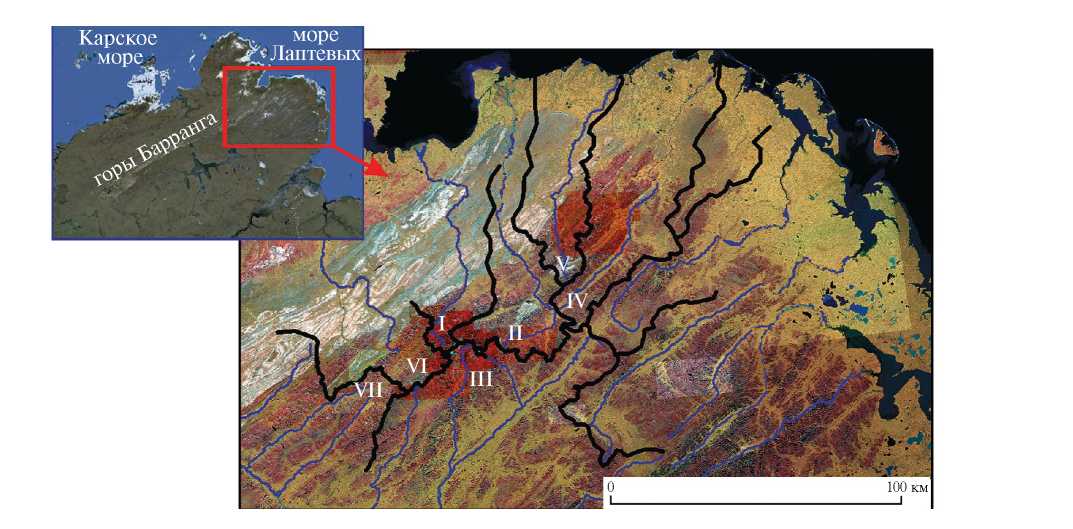 Рис. 3. Снимок на район гор Бырранга с выделением ледниковых бассейнов. Римскими цифрами обозначены бассейны: I – р. Преградная – Залив Фаддея – мыс Лаптевых; II – р. Толля – Клюевка – мыс Лаптевых ; III – р. Ледниковая – р. Малахайтари – оз. Таймыр; IV – р. Рыбная – море Лаптевых; V – р. Географа – море Лаптевых; VI – р. Ленинградская – Карское море; VII – р. Сочавы – р. НюнькаракуТари – оз. Таймыр