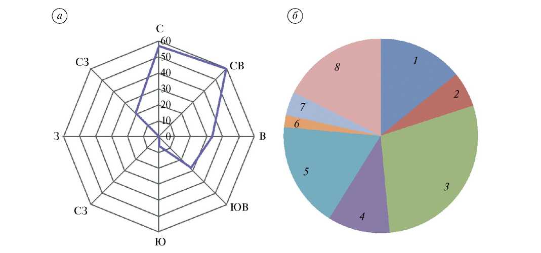 Fig. 4. Distribution of Byrranga glaciers in 2022 by aspect (а); and by morphological type (б). The numbers indicate the types: 1 – hanging; 2 – valley; 3 – corrie-hanging; 4 – corrie-valley; 5 – corrie; 6 – couloirs; 7 – transfluent; 8 – slope