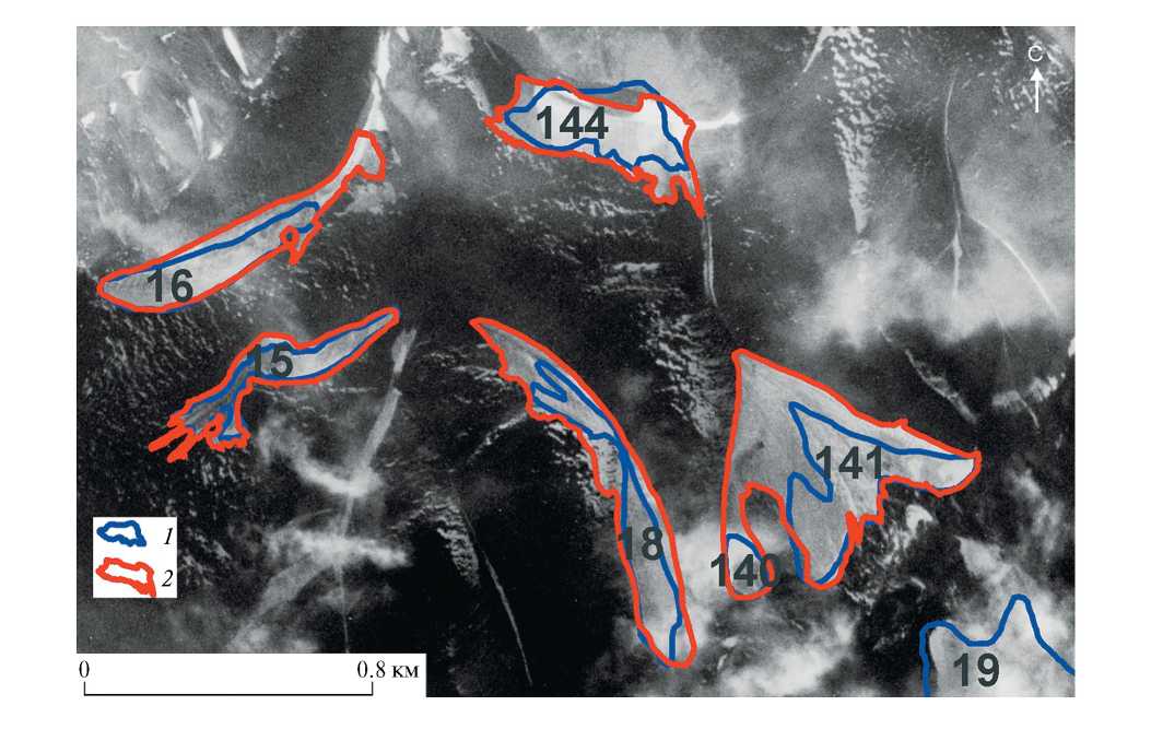Рис. 6. Фрагмент снимка CORONA с контурами ледников: 1 – по Sentinel-2, 2022 г.; 2 – по CORONA, 1966 г.