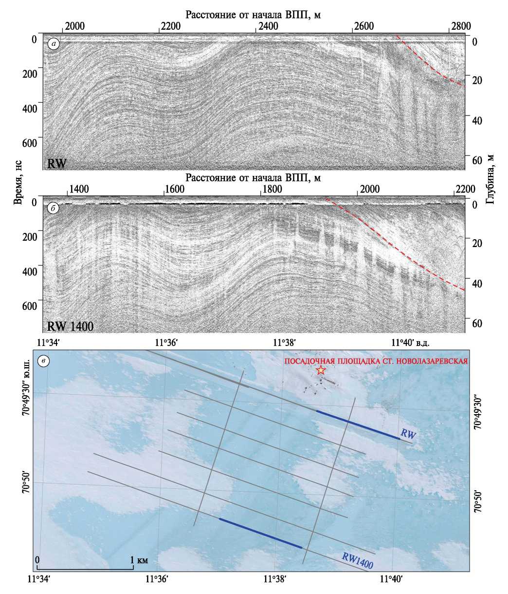Fig. 4. Zone of crevasses on the limbs and in the core of anticline: mostly healed with ice crevasses on the runway (а); large near-surface crevasses located 1.4 km south of the runway (б); chart of the location of fragments of GPR profiles in sections а and в (в). In sections а and б, the red dashed line shows the lower boundary of the superimposed ice