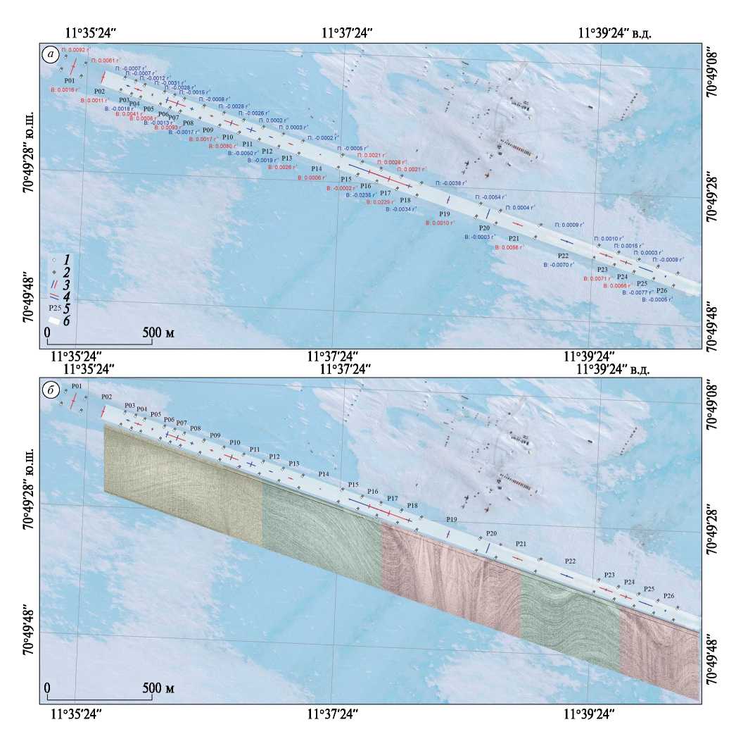 Совместный анализ георадиолокации и геодезии позволил также разделить всю взлётно-посадочную полосу на три области, где цветом отображена степень необходимости ежегодного мониторинга (см. рис. 6, а). Зелёным цветом показана наиболее стабильная область. Она характеризуется согласно залегающими субгоризонтальными слоями в тоще ледника и его минимальными скоростями деформаций. Жёлтым цветом показана область, требующая тщательного визуального мониторинга. Это объясняется тем, что в её пределах отмечаются незначительные продольные деформации растяжения и сжатия, а также некрупные (до 20 см), выходящие к поверхности, но преимущественно залеченные трещины. Красным цветом показана область, требующая наиболее тщательного визуального и инструментального мониторинга в процессе эксплуатации полосы. Она характеризуется наличием как структур с несогласными субвертикальными контактами в зоне сочленения ледовых потоков, так и относительно крупных, но не приповерхностных трещин на сводах антиклинальных складок. Указанная область демонстрирует максимально неравномерную скорость движения ледника как в пространстве, так и во времени. Эта область представляется наиболее нестабильной в долгосрочной перспективе.
