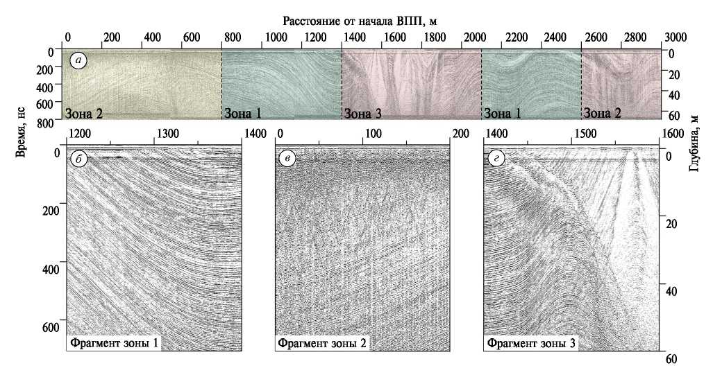 Зона 2. Смятые в складки толщи с трещинами разного размера и глубины заложения (см. рис. 6, а, в). Наблюдается преимущественно в начале и конце взлётно-посадочной полосы. Начало полосы, примерно первые 800 м, характеризуется наличием некрупных, до 20 см в поперечнике, залеченных трещин. Они отчётливо фиксируются на радарограммах в виде обилия дифрагированных волн, а также прослеживаются визуально на открытых участках льда. Подобное поле трещин наблюдается и в южной части района работ, где они шире и подходят к поверхности. Будучи залеченными на ВПП и в ближайших окрестностях, что подтверждено бурением и визуальными наблюдениями, такие трещины не представляют опасности. Однако, как было отмечено в предыдущем разделе, в года с низкими среднегодовыми температурами, а в особенности холодными летними сезонами, трещины могут не заполняться водой и, следовательно, не залечиваться. В этой связи указанная область требует мониторинга и регулярных визуальных наблюдений.