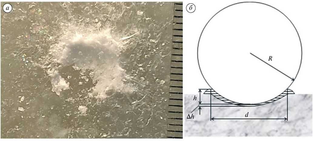 В настоящей работе в качестве ударного инструмента использовали стальной шар радиусом R = 15 мм, массой m = 110 г. Шар падал по почти вертикальному желобу (угол наклона к горизонтали 85°). Высота падения составляла H = 1 м. Шар при падении проскальзывал по желобу, не раскручиваясь. Контейнер с образцом льда плотно прилегал к поверхности лабораторного стола, и при ударах шаром не обнаруживал заметных колебаний. На рис. 1, а приведена фотография лунки, оставленная шаром на поверхности льда. После удара шар отскакивал от лунки и вторично касался поверхности рядом с ней. Высота упругого отскока шара от лунки составляла 1–2 мм, что составляет 0.1–0.2% от высоты падения шара. Следовательно, более 99% потенциальной энергии шара расходовалось на пластическую деформацию и разрушение льда. Шар перед испытаниями охлаждали до температуры льда.