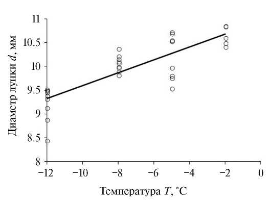 На рис. 2 изображена зависимость диаметров лунок от значений температуры льда, при которой его испытывали. Среднее значение диаметра лунки растёт с увеличением температуры, при этом рост значительно превышает среднеквадратичную ошибку. То есть, объём разрушенного льда также растёт и, следовательно, прочность уменьшается. Это типичное поведение прочности льда с ростом температуры (Богородский, Гаврило, 1980).