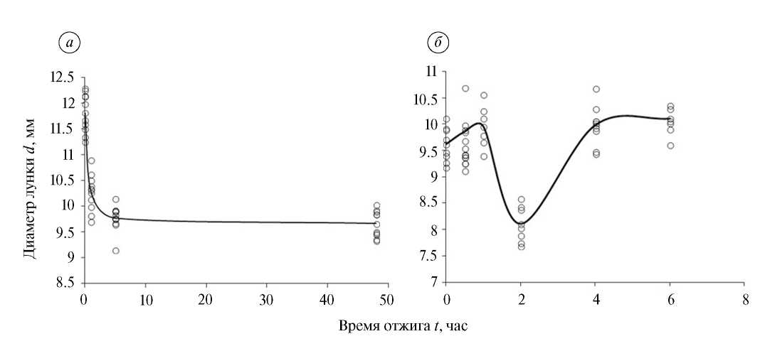 Влияние отжига льда на результаты испытаний демонстрирует рис. 4. Температура испытаний –12 °C. На рис 4, а отжиг выполняли при температуре –1.5 °C. С увеличением времени отжига (одного и того же образца), в интервале 1–48 часов, диаметр лунки уменьшается примерно на 20%. Подобные испытания были проведены ещё на двух образцах, приготовленных по такой же технологии при температуре отжига –1.5 °C. Данные для разных образцов совпали друг с другом с точностью около 10%, и все образцы демонстрировали уменьшение объёма разрушения и, следовательно, увеличение прочности с ростом времени отжига. Наиболее быстрое уменьшение диаметра лунки наблюдалось в интервале времен отжига 0–5 часов. То есть, 5 часов – это время релаксации прочности льда при температуре –1.5 °C.
