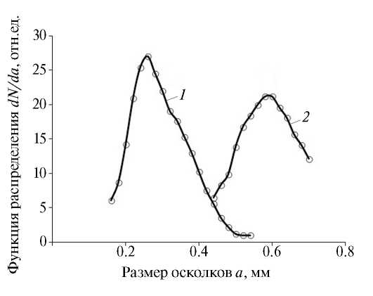 Рис. 6. Функция распределения осколков льда ∂N/∂a по размерам a. (1) – при среднем диаметре лунок 8 мм после 2-часового отжига, (2) – 10 мм после 6-часового отжига