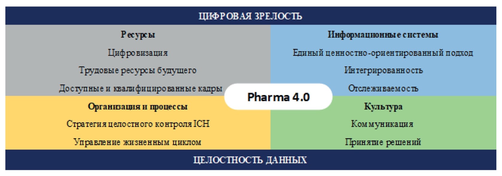 В настоящее время фармацевтическая промышленность испытывает дифференциацию продуктов (обусловленную быстрым прогрессом в области биотехнологий, генетики и лечения редких заболеваний) и сегментацию рынка (обусловленную более многочисленным стареющим населением и глобальным рынком с различными региональными возможностями и ограничениями). Отрасли нужен переломный момент: Phаrmа 4.0TM. В то время как элементы и стимулы Индустрии 4.0 в целом применимы ко всем отраслям, Phаrmа 4.0™ отличается потребностью фармацевтической промышленности и ее регулирующих органов в обеспечении безопасности пациентов и результатов в отношении долговременного влияния на здоровье лекарственных продуктов [10]. Этот приоритет требует согласования контроля качества с Phаrmа 4.0™; кроме того, стратегия управления должна быть дополнена той же операционной моделью и технологиями, которые используются при разработке и эксплуатации. Другими словами, необходима целостная стратегия цифрового контроля на каждом этапе производства, а в идеале и последующего мониторинга в ходе жизненного цикла пациента.