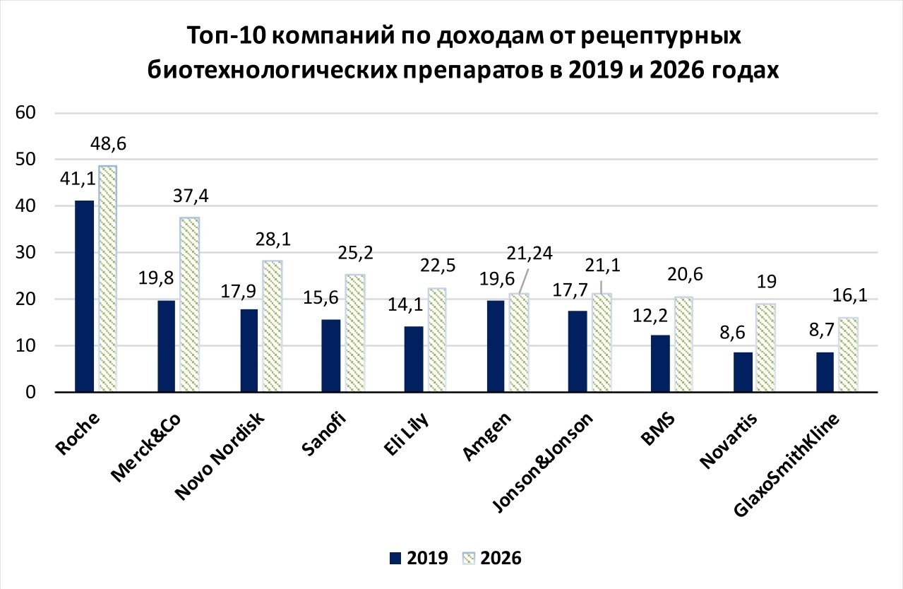 Рисунок 3. Доход от продажи рецептурных биотехнологических препаратов в 2019 и 2026 гг.