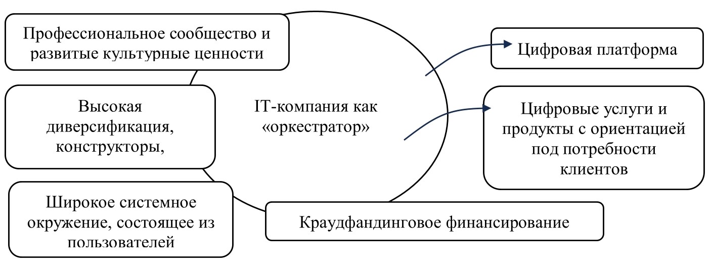 В модели платформенной экосистемы заложен принцип сервитизации [17]. Платформа получает эффекты от масштаба благодаря лучшему и индивидуальному удовлетворению потребности клиентов. Операторы экосистемы определяют содержание и уровни взаимодействия агентов. В структуре цифровая платформа – это центр, соединяющий ядро с постоянно меняющимися партнерами. Л. А. Раменская [7] описывает платформу как экосистему, позволяющую удовлетворять потребности широкого круга потребителей и реализующую стратегические цели экосистемы. Оркестратор обеспечивает рост скорости выхода продукции на рынок, масштабируемость бизнеса, привлечение новых клиентов, мониторинг их запросов, интеграцию решений и организацию межотраслевого сотрудничества.
