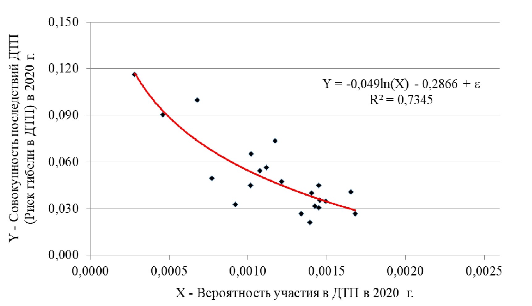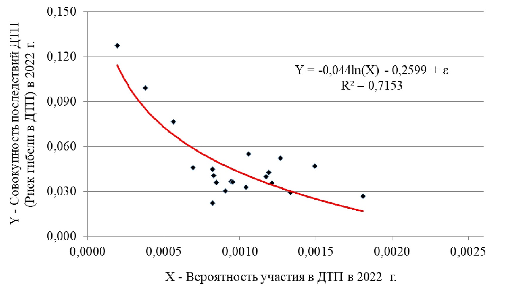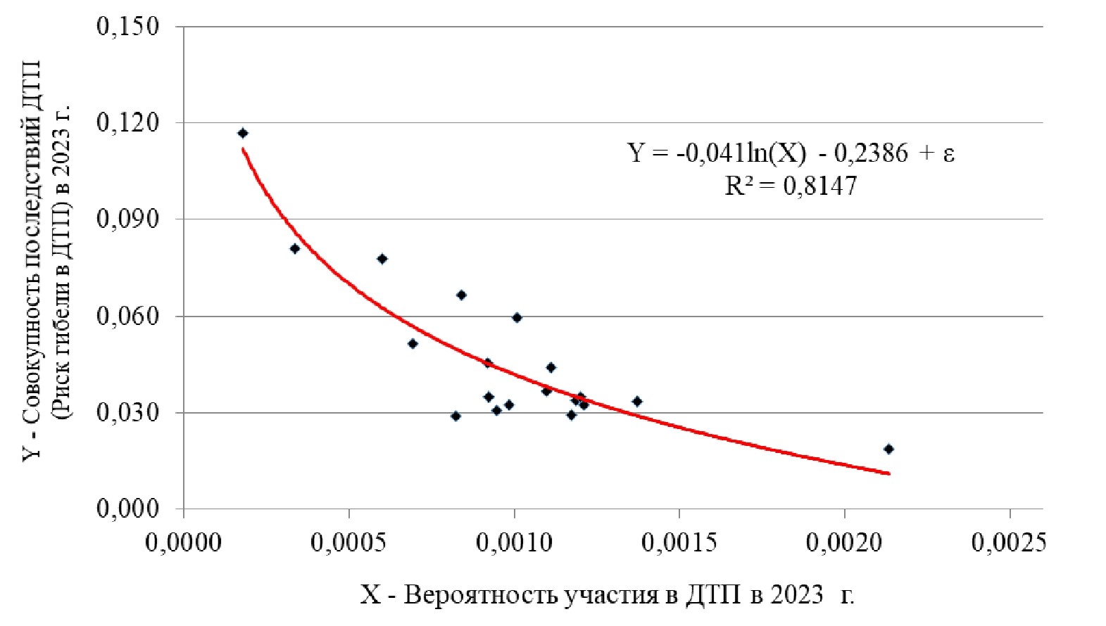 - Тезис о диалектически дуальной сущности характеристик «Риск участия в абстрактном ДТП PRTA» и «Риск гибели в конкретном ДТП ConsRTA» доказывает вид экспериментальных зависимостей ConsRTA год = f(PRTA год ), описываемых логарифмическими моделями.