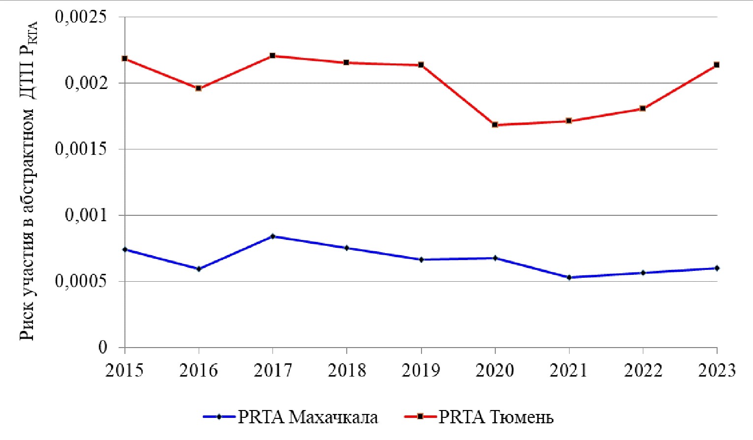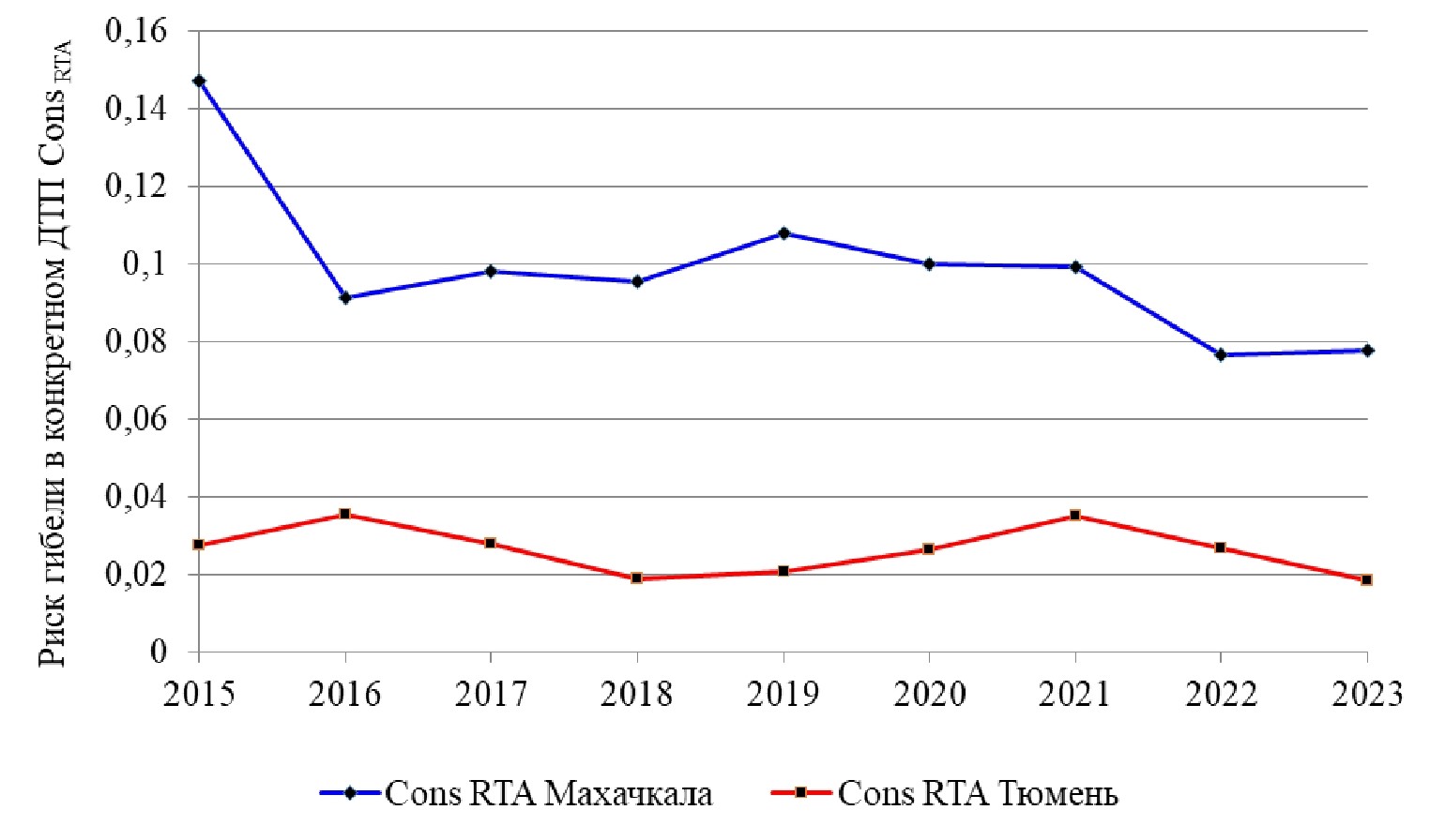 Таблица 6. Динамика (2015–2023) показателей ConsRTA и PRTA для системы обеспечения БДД в г. Махачкала