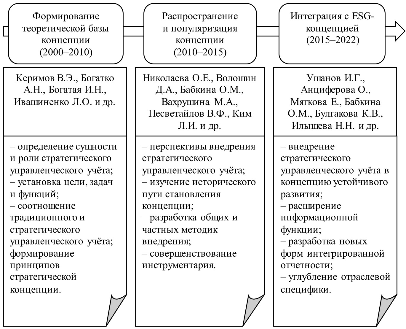 Несмотря на активное распространение и внедрение стратегического подхода в процессы планирования, контроля, учёта и прогнозирования хозяйственной деятельности, стратегический управленческий учёт, как отмечает Ким Л. И., это относительно новое научное направление, не имеющее строго регламентированных границ или унифицированных форм [6]. Попытки идентификации сущности стратегического управленческого учёта и его роли в системе менеджмента были предприняты в работах: Бабкиной О. М., Богатой И. Н., Ивашиненко Л. О., Вахрушиной М. А., Галаутдиновой В. В., Друри К., Ким Л. И., Несветайлова В. Ф., Николаевой О. Е., Волошина Д. А., Проняевой Л. И., Галкиной К. Н., Хапсироковой А. Я., Чепраковой Т. Н., Хахоновой И. И., Хахоновой Н. Н., Ж. Хуан (Zh. Huang), Т. Ху (T. Hu), Ц. Хуан (J. Huang), А. С. Сетиаван (A. S. Setiawan), Дж. Искак (J. Iskak) и многих других отечественных и зарубежных учёных-экономистов [1-3; 5-9; 14; 19; 23].