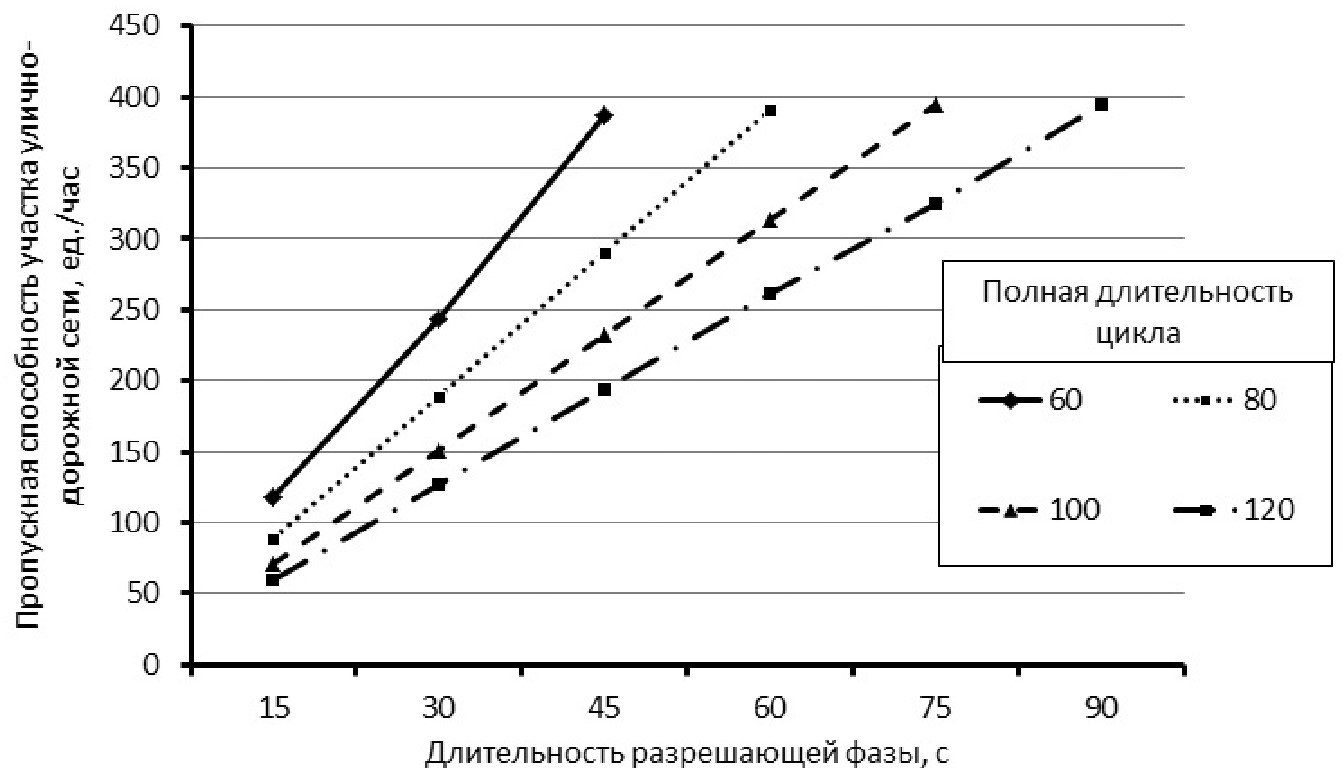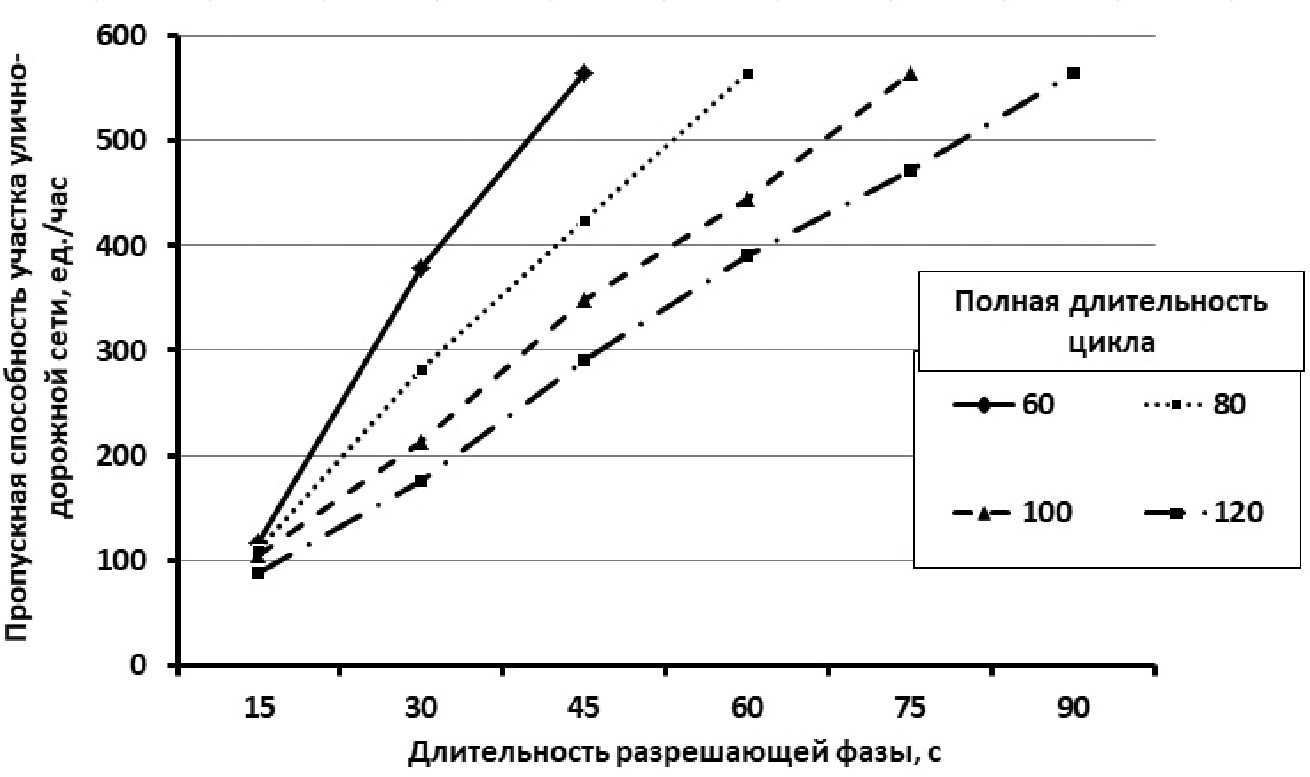 По результатам моделирования получены данные, определяющие влияние параметров светофорного регулирования на пропускную способность участка улично-дорожной сети. Значения пропускной способности, полученные при организации пассажирообмена через две двери с односторонним движением, в виде графиков представлены на рисунке 3.