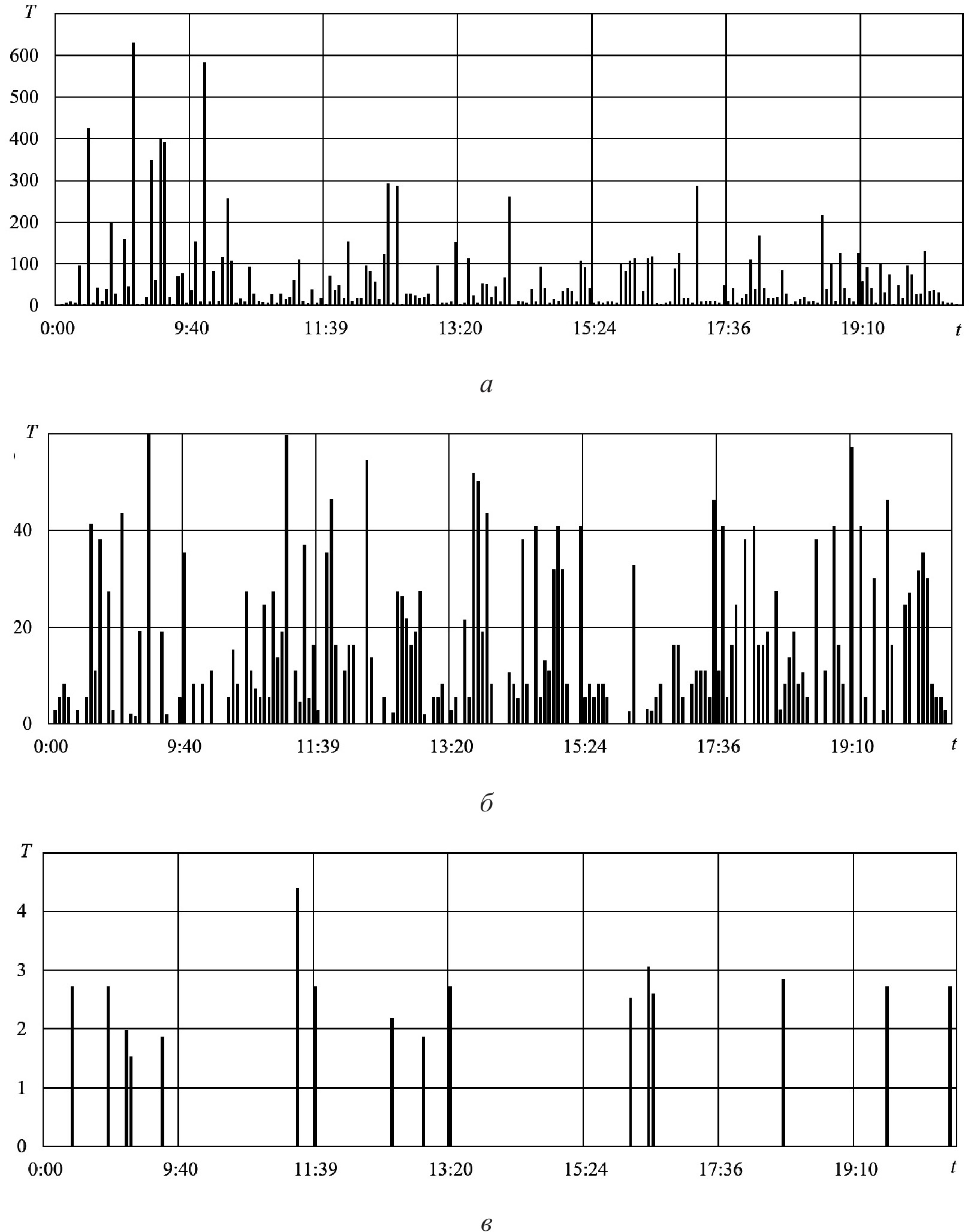 Рисунок 2. Распределение по времени t (час:мин) продолжительностей T (мин) стоянок автомобилей на парковке в течение суток; а – общая продолжительность, б – парковки продолжительностью менее 60 минут, в – парковки продолжительностью не более 5 минут; рабочий день (среда), октябрь 2023 года