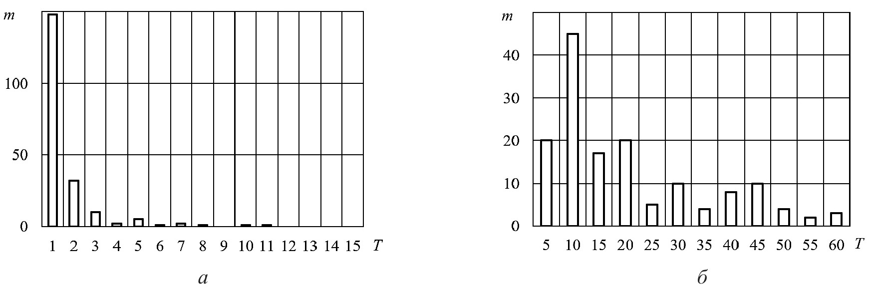 На рисунке 2 показано распределение по времени продолжительностей стоянок автомобилей на парковке в течение суток; на оси абсцисс указано время, соответствующее въезду автомобилей на территорию парковочного пространства, на оси ординат – продолжительность нахождения автомобилей на парковочной территории. На рисунке 3 представлены гистограммы количества автомобилей по продолжительности пребывания всех автомобилей на парковочном пространстве в течение суток наблюдения (рисунок 3а), в том числе автомобилей, которые посещали парковку на время не более 60 мин (рисунок 3б). На рисунке 3а продолжительности парковки ограничены 15 часами, так как более длительное время нахождения автомобилей на парковочной территории не зафиксировано.