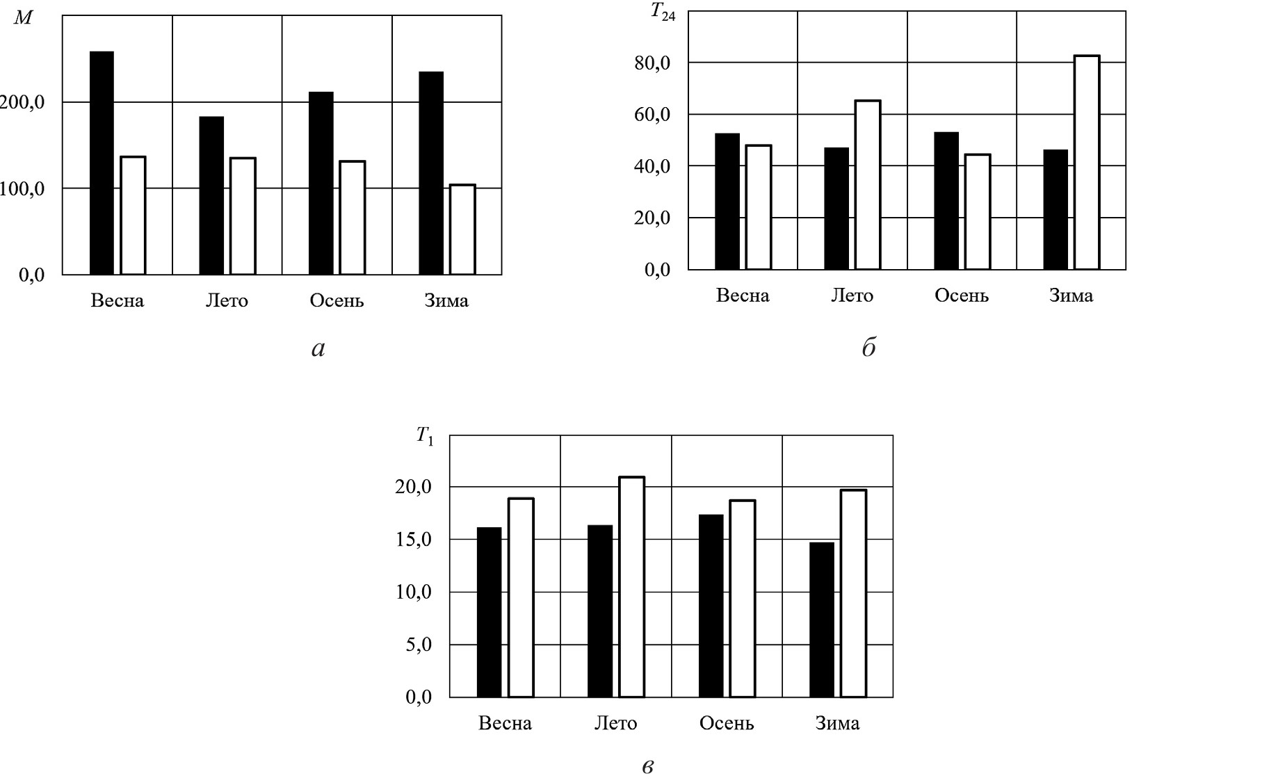 Рисунок 6. Средние значения количества M парковочных сессий (а), продолжительностей T24 парковок в течение суток (б) и продолжительностей T1 размещения автомобилей менее 1 часа (в); осреднение по рабочим (с понедельника по субботу, ■) и нерабочим дням (воскресенье, □) по соответствующим месяцам
