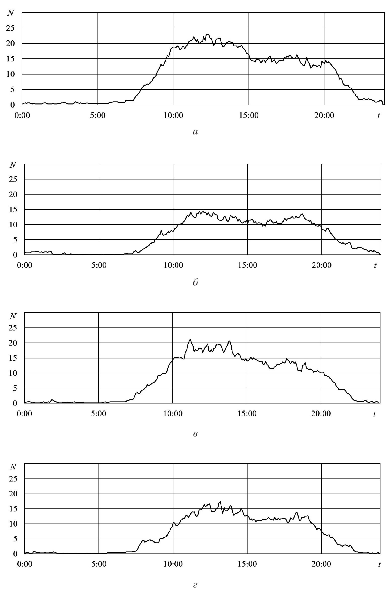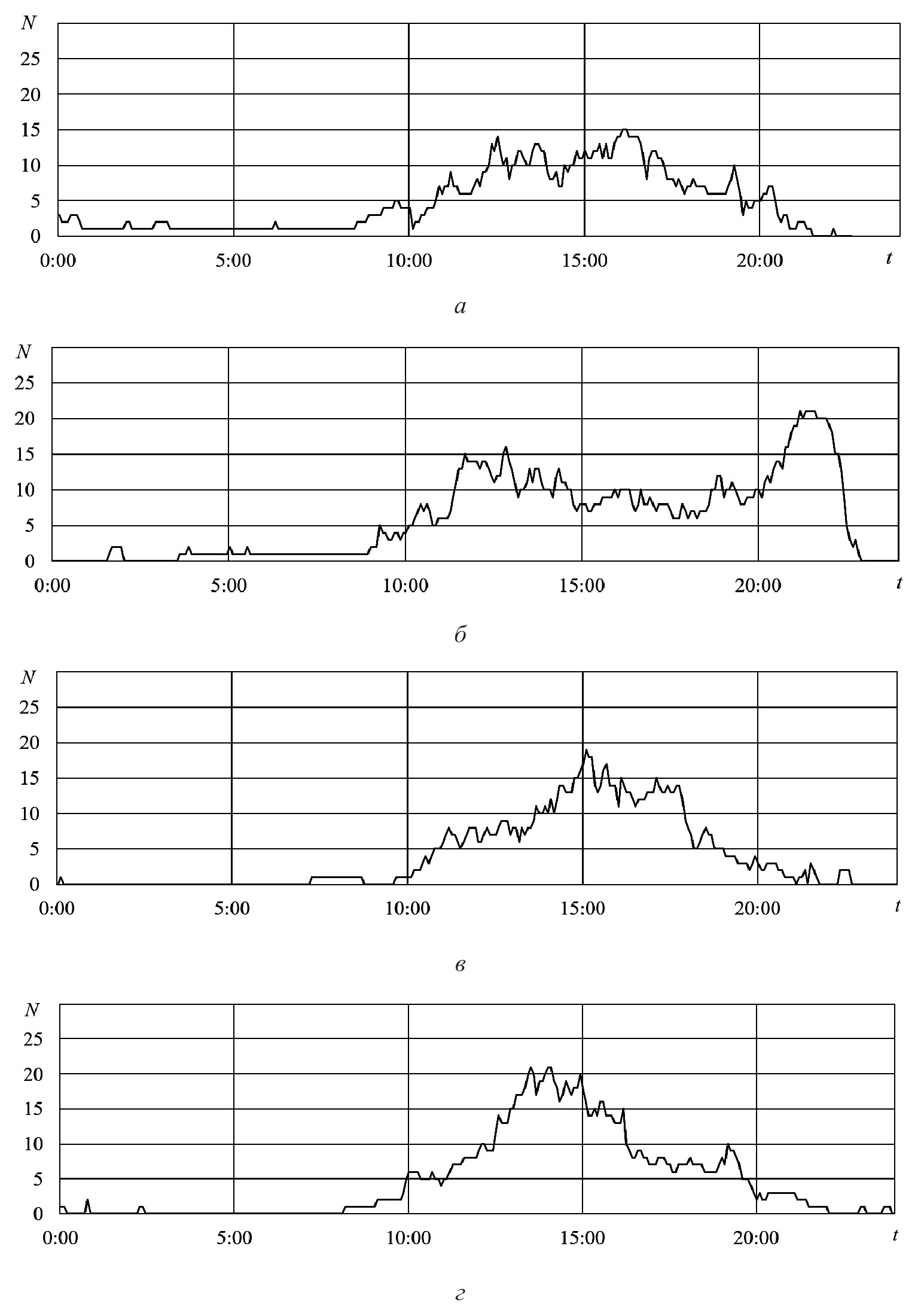 Рисунок 7. Зависимости от времени t (час:мин) осредненной с понедельника по субботу заполняемости N (авт) парковочного пространства; а – апрель, б – июль, в – октябрь 2023 года, г – февраль 2024 года