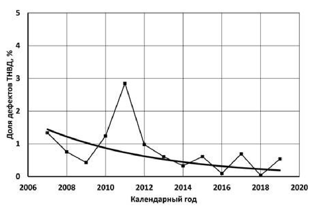 В период с 2007 по 2019 годы собирались данные о дефектах элементов ТА двигателей КАМАЗ в гарантийный период эксплуатации. Было установлено, что общее число дефектов элементов ТА (включая привод ТНВД, трубопроводов и крепежных изделий) составляет до 12 % от всех дефектов двигателя. Из них доля дефектов ТНВД и форсунок доходит до 20 % в общем числе дефектов ТА. В нашем случае будем рассматривать только дефекты ТНВД и форсунок. Определялась их доля в процентах дефектов этих элементов относительно суммарного количества дефектов двигателя. На рисунках 2 и 3 показаны графики изменения доли дефектов ТНВД и форсунок в исследуемый период.